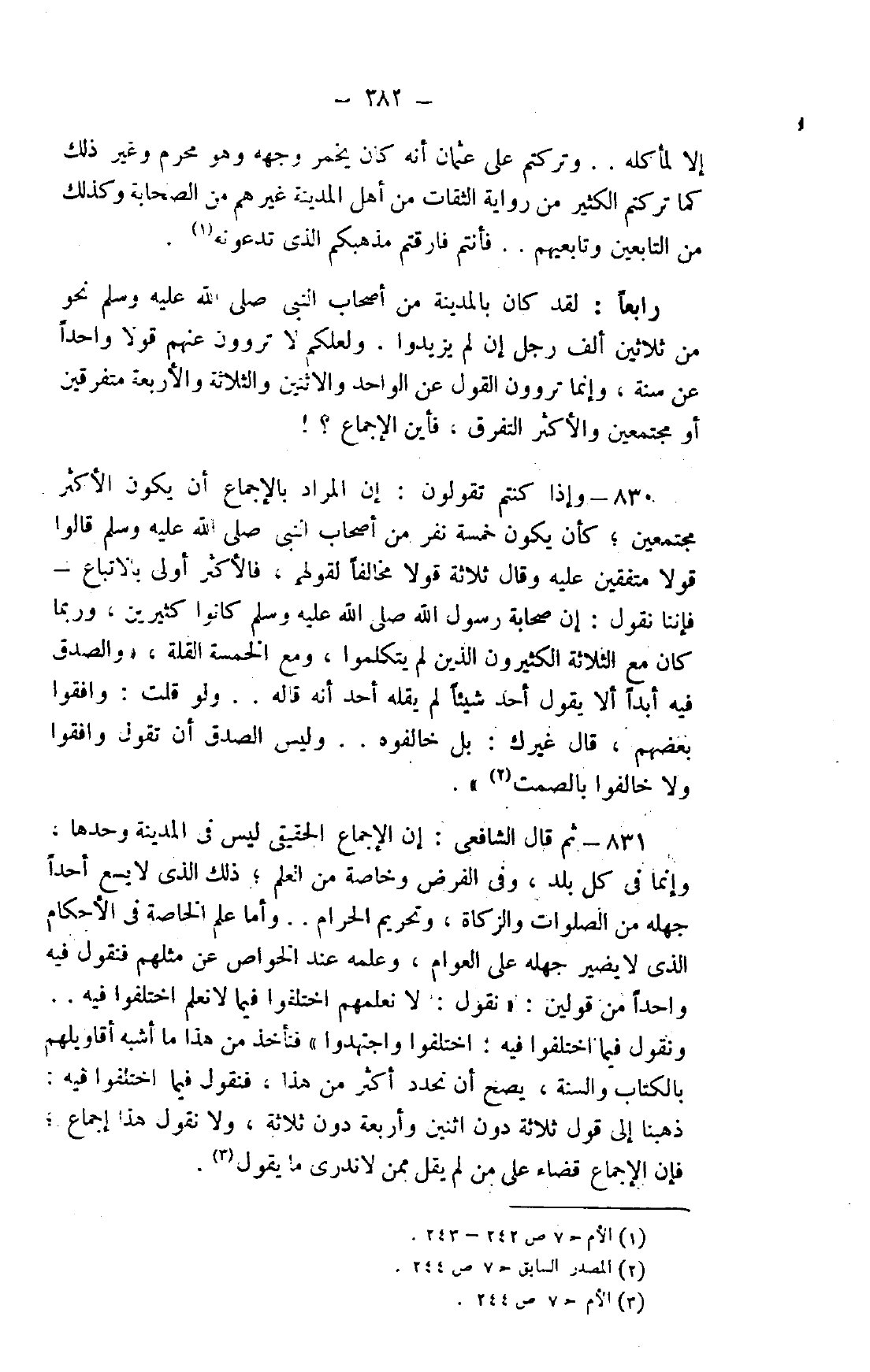 831- ثم قال الشافعي: إن الإجماع الحقيقي ليس في المدينة وحدها، وإنما في كل بلد، وفي الفرض وخاصة من العلم؛ ذلك الذي لا يسع أحدًا جهله من الصلوات والزكاة، وتحريم الحرام.. وأما علم الخاصة في الأحكام الذي لا يضير جهله على العوام، وعلمه عند الخواص عن مثلهم فنقول فيه واحدًا من قولين: "نقول: لا نعلمهم اختلفوا فيما لا نعلم اختلفوا فيه.. ونقول فيما اختلفوا فيه: اختلفوا واجتهدوا" فنأخذ من هذا ما أشبه أقاويلهم بالكتاب والسنة، يصح أن نحدد أكثر من هذا، فنقول فيما اختلفوا فيه: ذهبنا إلى قول ثلاثة دون اثنين وأربعة دون ثلاثة، ولا نقول هذا إجماع؛ فإن الإجماع قضاء على من لم يقل ممن لا ندري ما يقول3.