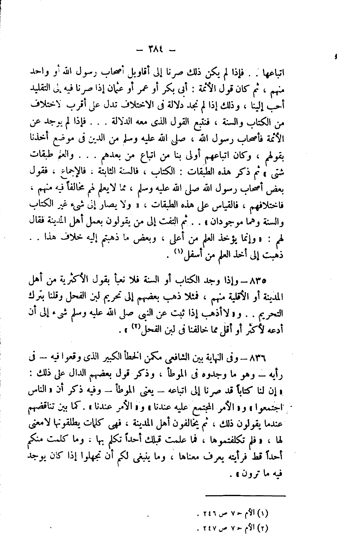 835- وإذا وجد الكتاب أو السنة فلا نعبأ بقول الأكثرية من أهل المدينة أو الأقلية منهم، فمثلًا ذهب بعضهم إلى تحريم لبن الفحل وقلنا بترك التحريم ... و"لا أذهب إذا ثبت عن النبي صلى الله عليه وسلم شيء إلى أن أدعه لأكثر أو أقل مما خالفنا في لبن الفحل"2.