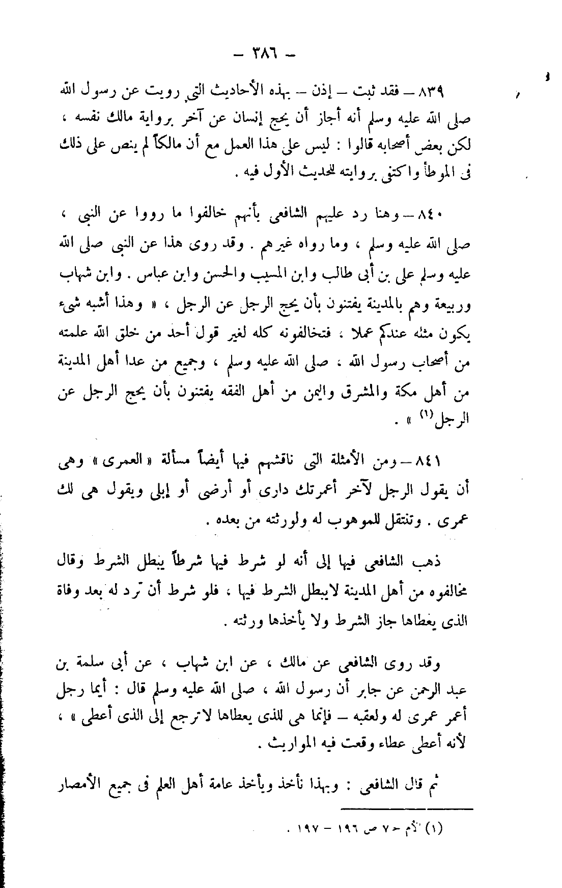 841- ومن الأمثلة التي ناقشهم فيها أيضًا مسألة "العمرى" وهي أن يقول الرجل لآخر: أعمرتك داري أو أرضي أو إبلي ويقول: هي لك عمري. وتنتقل للموهوب له ولورثته من بعده.