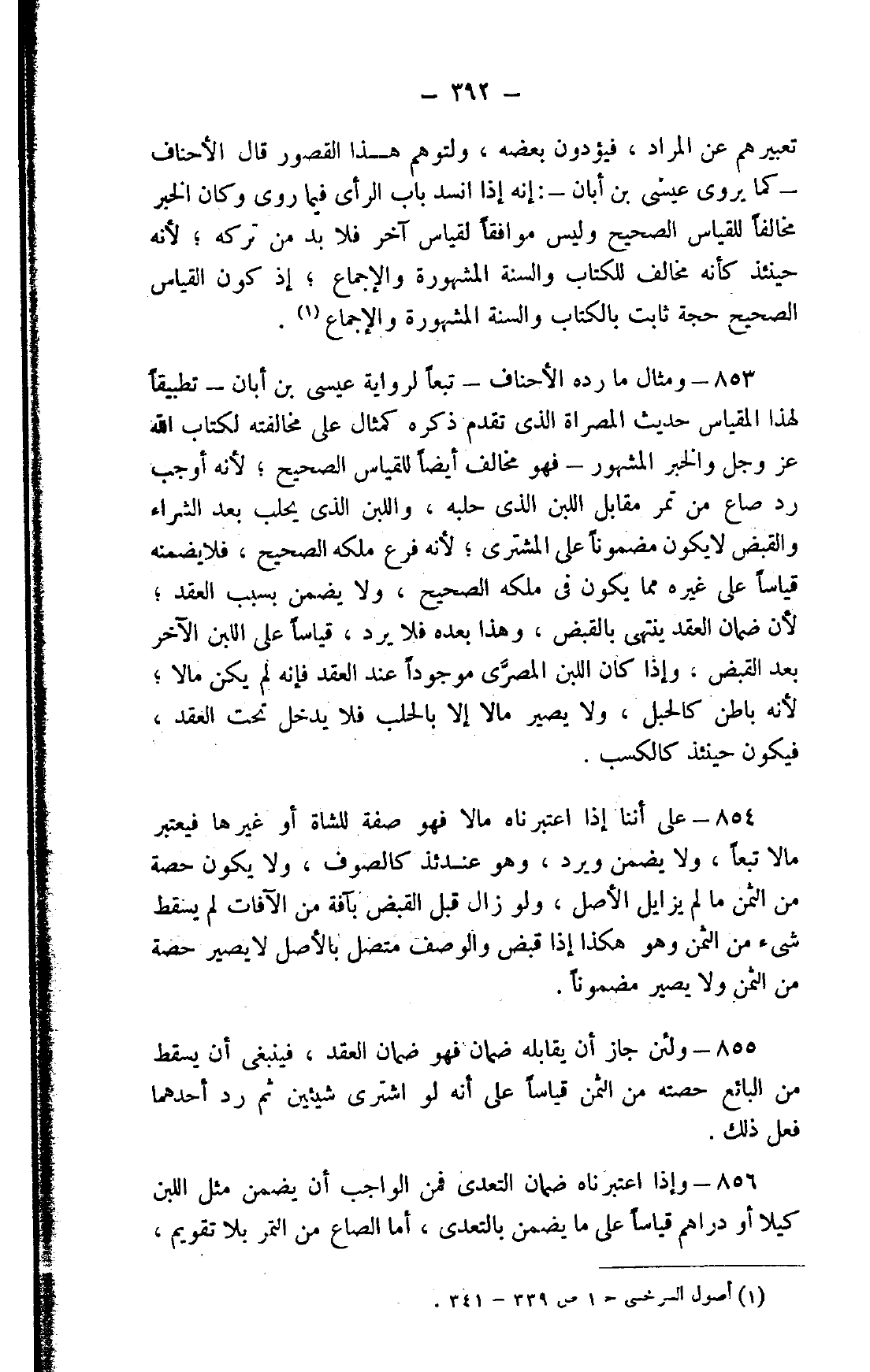 853- ومثال ما رده الأحناف -تبعًا لرواية عيسى بن أبان- تطبيقًا لهذا المقياس حديث المصراة الذي تقدم ذكره كمثال على مخالفته لكتاب الله عز وجل والخبر المشهور -فهو مخالف أيضًا للقياس الصحيح؛ لأنه أوجب رد صاع من تمر مقابل اللبن الذي حلبه، واللبن الذي يحلب بعد الشراء والقبض لا يكون مضمونًا على المشتري؛ لأنه فرع ملكه الصحيح، فلا يضمنه قياسًا على غيره مما يكون في ملكه الصحيح، ولا يضمن بسبب العقد؛ لأن ضمان العقد ينتهي بالقبض، وهذ بعده فلا يرد، قياسًا على اللبن الآخر بعد القبض، وإذا كان اللبن المصرى موجودًا عند العقد فإنه لم يكن مالًا؛ لأنه باطن كالحبل، ولا يصير مالًا إلا بالحلب فلا يدخل تحت العقد، فيكون حينئذ كالكسب.
