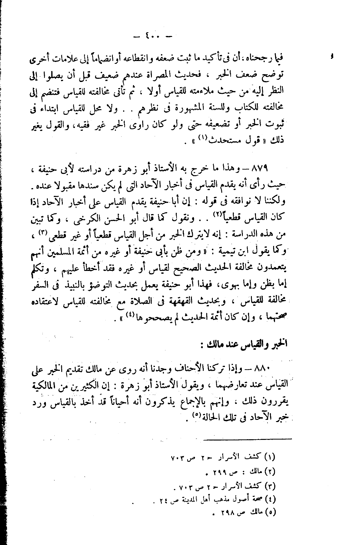 879- وهذا ما خرج به الأستاذ أبو زهرة من دراسته لأبي حنيفة، حيث رأى أنه يقدم القياس في أخبار الآحاد التي لم يكن سندها مقبولًا عنده.