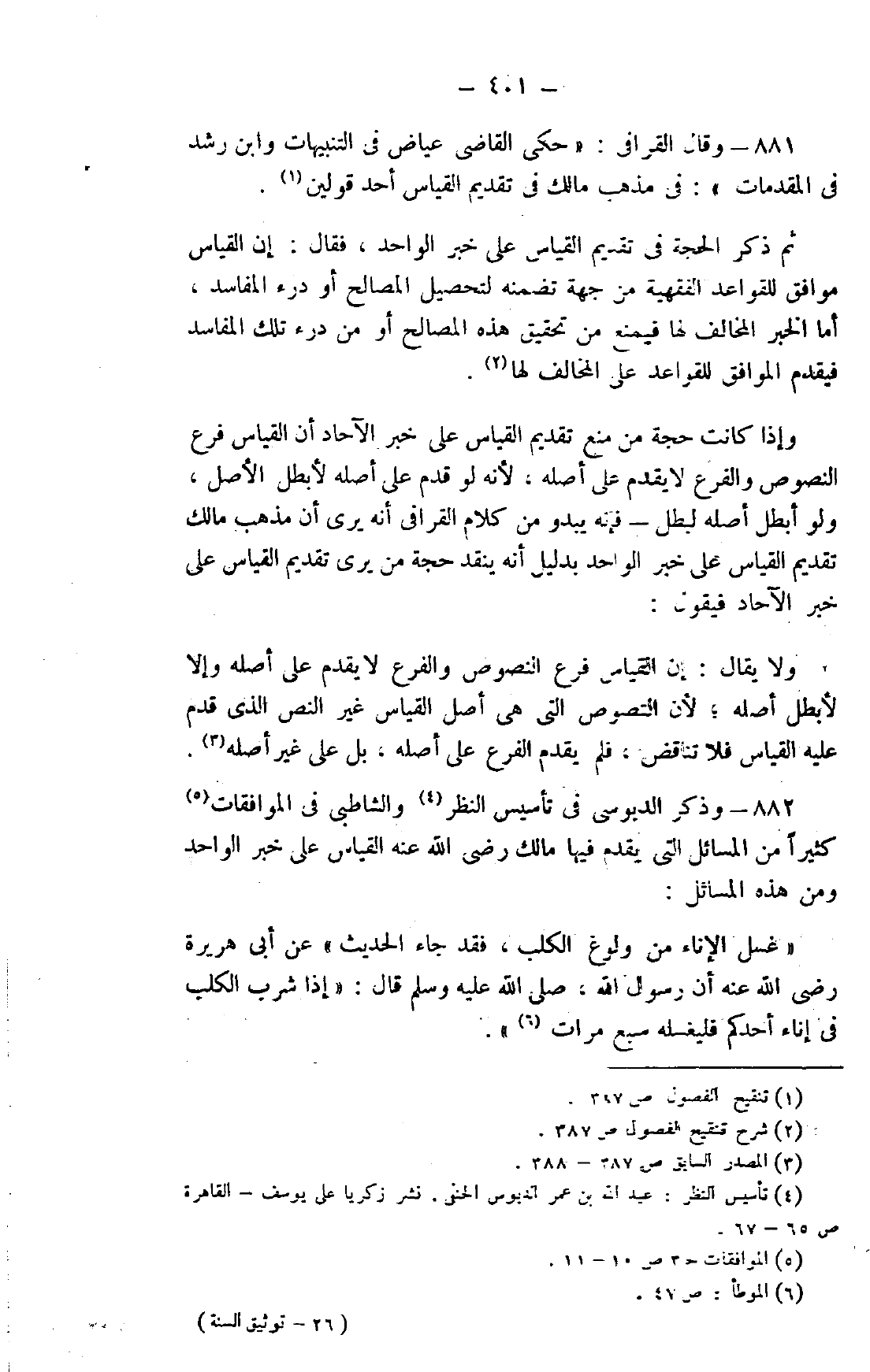 881- وقال القرافي: "حكى القاضي عياض في التنبيهات وابن رشد في المقدمات: في مذهب مالك في تقديم القياس أحد قولين1.