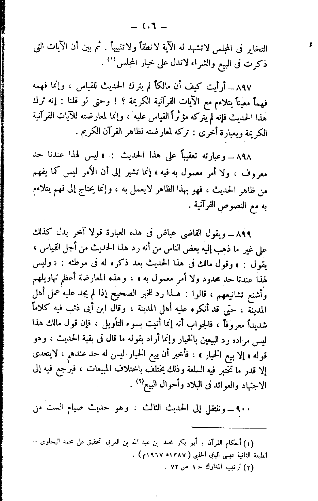 897- أرأيت كيف أن مالكًا لم يترك الحديث للقياس، وإنما فهمه فهمًا معينًا يتلاءم مع الآيات القرآنية الكريمة؟! وحتى لو قلنا: إنه ترك هذا الحديث فإنه لم يتركه مؤثرًا القياس عليه، وإنما لمعارضته للآيات القرآنية الكريمة وبعبارة أخرى: تركه لمعارضته لظاهر القرآن الكريم.