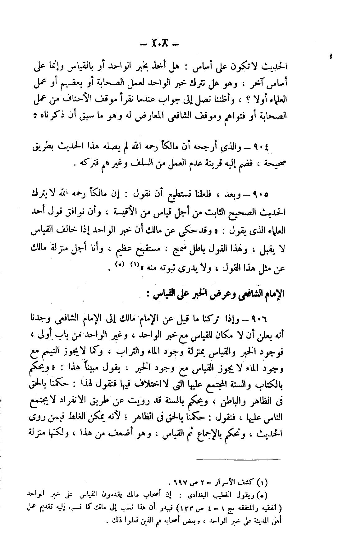 الحديث لا تكون على أساس: هل أخذ بخبر الواحد أو بالقياس وإنما على أساس آخر، وهو هل نترك خبر الواحد لعمل الصحابة أو بعضهم أو عمل العلماء أولًا؟ وأظننا نصل إلى جواب عندما نقرأ موقف الأحناف من عمل الصحابة أو فتواهم وموقف الشافعي المعارض له وهو ما سبق أن ذكرناه.