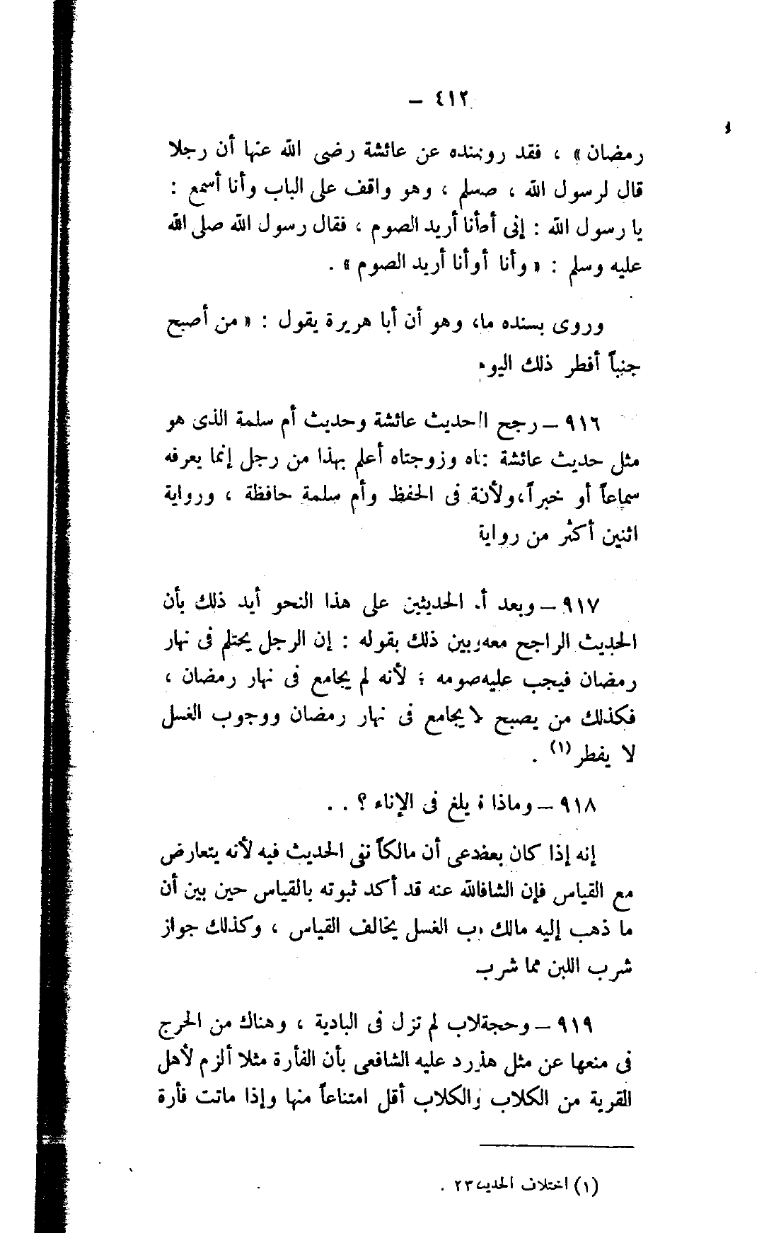 916- رجح الإمام الشافعي حديث عائشة وحديث أم سلمة الذي هو مثل حديث عائشة: لأنهما زوجتاه وزوجتاه أعلم بهذا من رجل إنما يعرفه سماعًا أو خبرًا، ولأن عائشة مقدمة في الحفظ وأم سلمة حافظة، ورواية اثنين أكثر من رواية واحد.