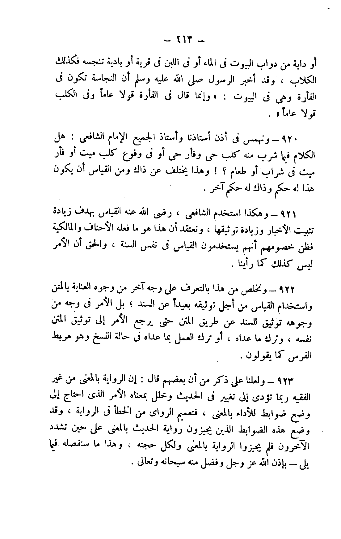921- وهكذا استخدام الشافعي، رضي الله عنه القياس بهدف زيادة تثبت الأخبار وزيادة توثيقها، ونعتقد أن هذا هو ما فعله الأحناف والمالكية فظن خصومهم أنهم يستخدمون القياس في نفس السنة، والحق أن الأمر ليس كذلك كما رأينا.