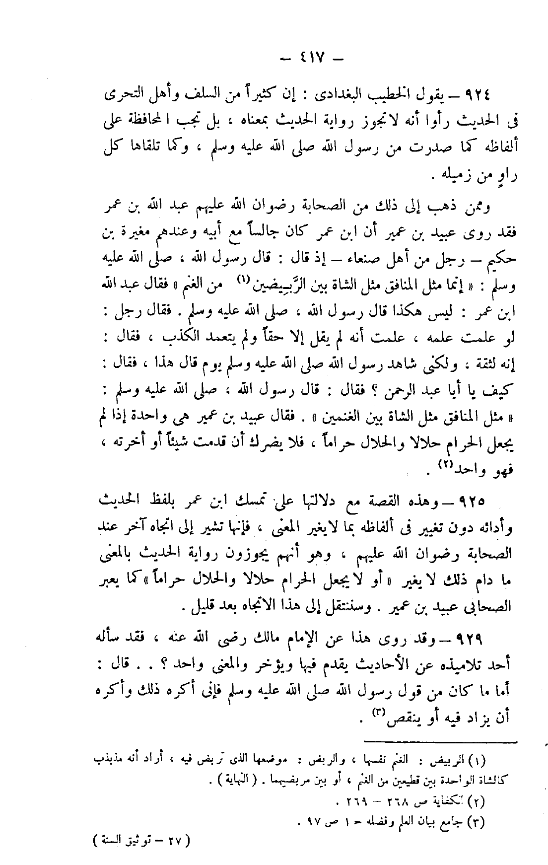 924- يقول الخطيب البغدادي: إن كثيرًا من السلف وأهل التحري في الحديث رأوا أنه لا تجوز رواية الحديث بمعناه، بل تجب المحافظة على ألفاظه كما صدرت من رسول الله صلى الله عليه وسلم، وكما تلقاها كل راو من زميله.