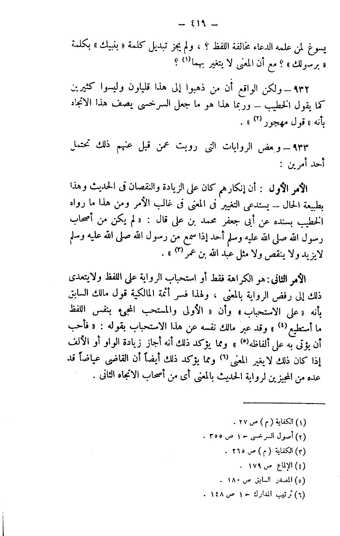 الأمر الثاني: هو الكراهة فقط أو استحباب الرواية على اللفظ ولا يتعدى ذلك إلى رفض الرواية بالمعنى، ولهذا فسر أئمة المالكية قول مالك السابق بأنه "على الاستحباب" وأن "الأولى والمستحب المجيء بنفس اللفظ ما أستطيع"4 وقد عبر مالك نفسه عن هذا الاستحباب بقوله: "فأحب أن يؤتي به على ألفاظه"5 ومما يؤكد ذلك أنه أجاز زيادة الواو أو الألف إذا كان ذلك لا يغير المعنى6 ومما يؤكد ذلك أيضًا أن القاضي عياضًا قد عده من المجيزين لرواية الحديث بالمعنى أي من أصحاب الاتجاه الثاني.