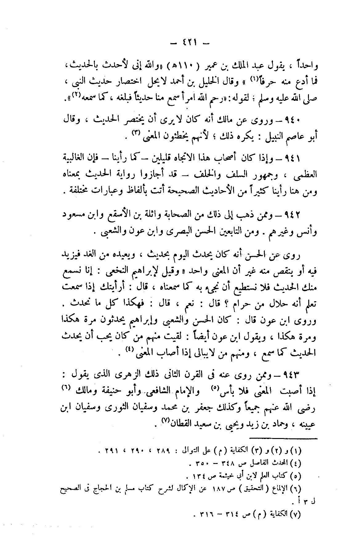 واحدًا، يقول عبد الملك بن عمير: "110هـ" "والله إني لأحدث بالحديث، فما أدع منه حرفًا"1 وقال الخليل بن أحمد: لا يحل اختصار حديث النبي، صلى الله عليه وسلم؛ لقوله: "رحم الله امرأ سمع منا حديثًا فبلغه، كما سمعه" 2.