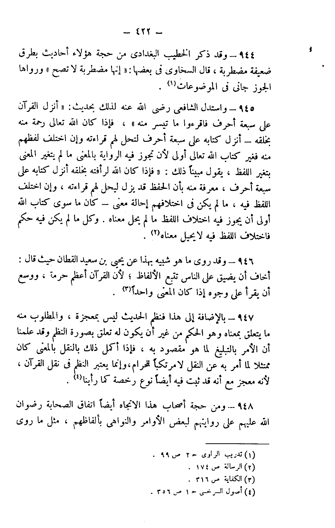 947- بالإضافة إلى هذا فنظم الحديث ليس بمعجزة، والمطلوب منه ما يتعلق بمعناه وهو الحكم من غير أن يكون له تعلق بصورة النظم وقد علمنا أن الأمر بالتبليغ لما هو مقصود به، فإذا أكمل بذلك بالنقل بالمعنى كان ممتثلًا لما أمر به عن النقل لا مرتكبًا للحرام، وإنما يعتبر النظم في نقل القرآن، لأنه معجز مع أنه قد ثبت فيه أيضًا نوع رخصة كما رأينا4.