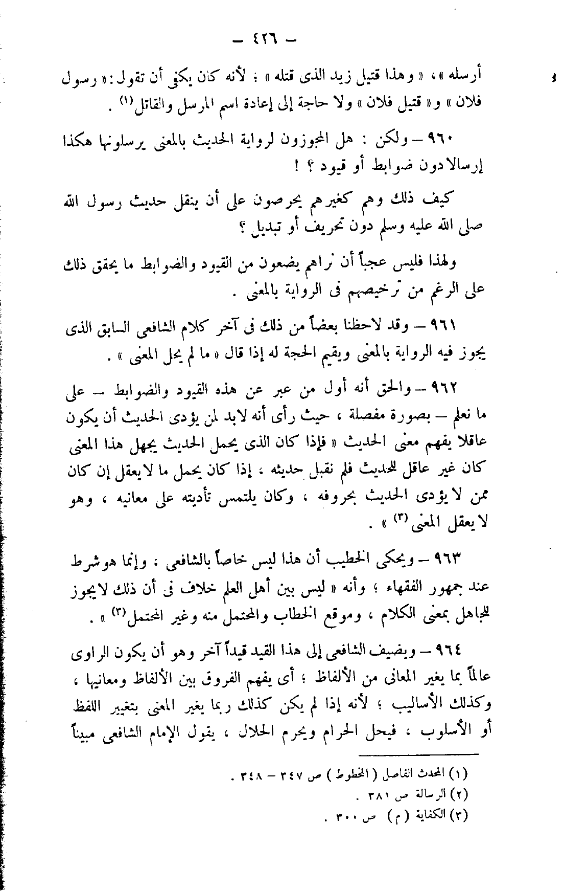 961- وقد لاحظنا بعضًا من ذلك في آخر كلام الشافعي السابق الذي يجوز فيه الرواية بالمعنى ويقيم الحجة له إذا قال: "ما لم يحل المعنى".