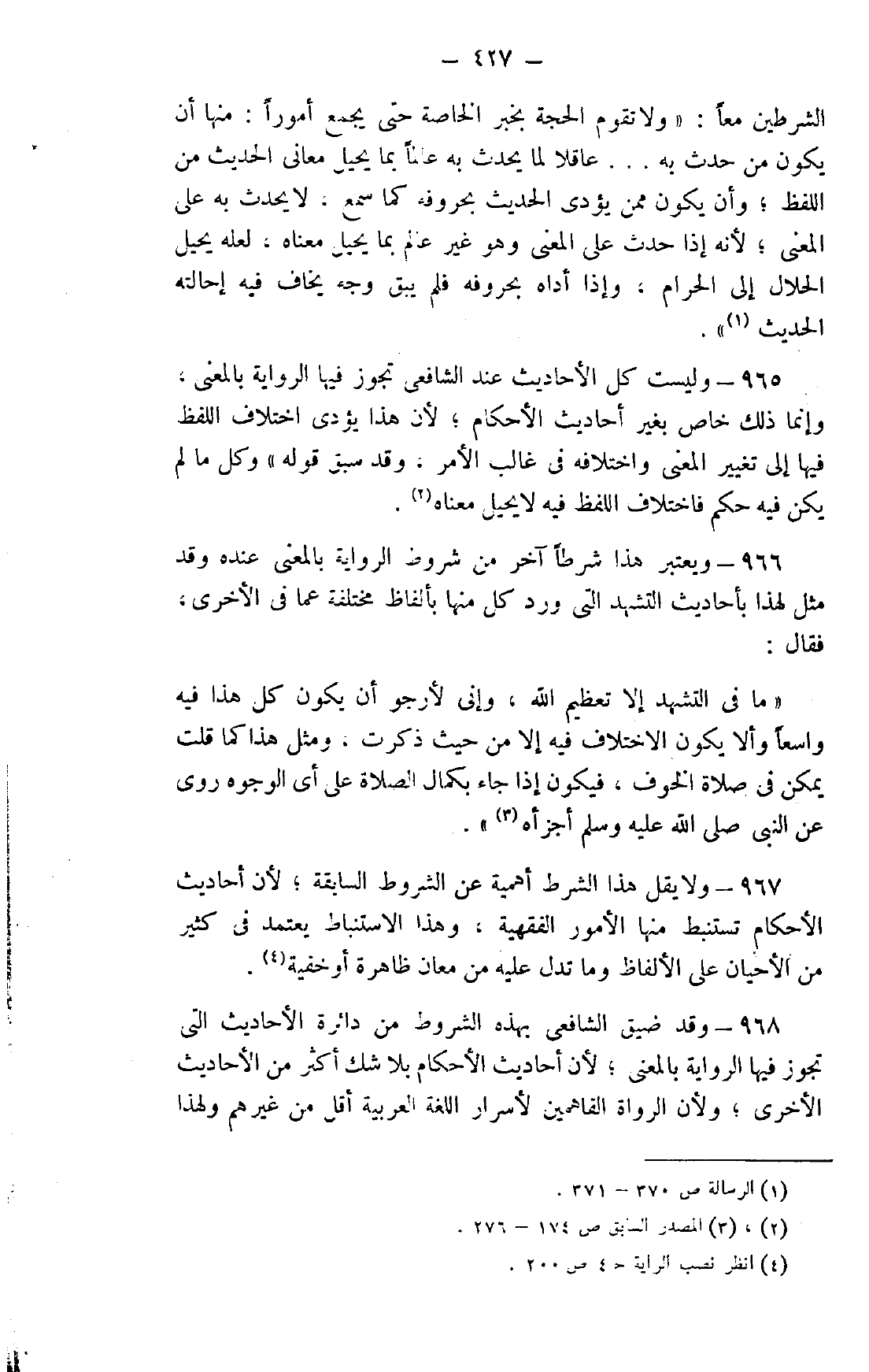 965- وليست كل الأحاديث عند الشافعي تجوز فيها الرواية بالمعنى، وإنما ذلك خاص بغير أحاديث الأحكام؛ لأن هذا يؤدي اختلاف اللفظ فيها إلى تغيير المعنى واختلافه في غالب الأمر، وقد سبق قوله" وكل ما لم يكن فيه حكم فاختلاف اللفظ فيه لا يحيل معناه2.