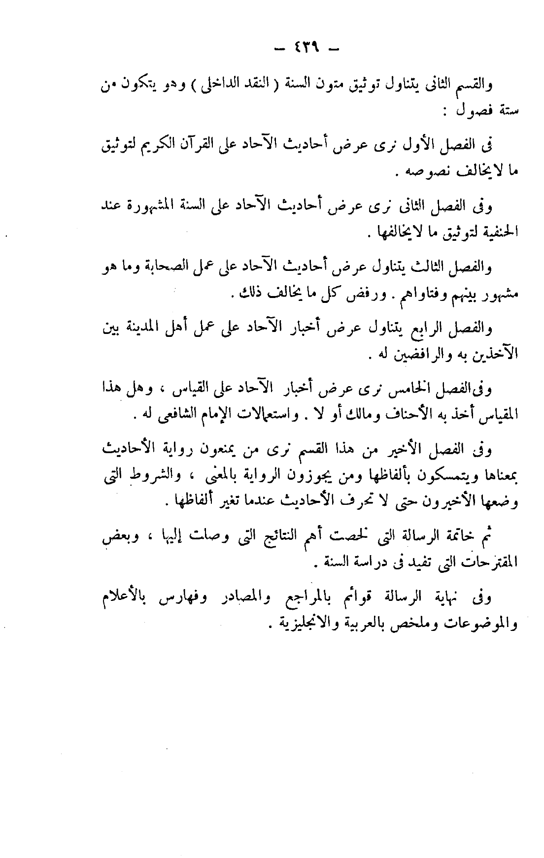 وفي الفصل الخامس نرى عرض أخبار الآحاد على القياس، وهل هذا المقياس أخذ به الأحناف ومالك أو لا.. واستعمالات الإمام الشافعي له.