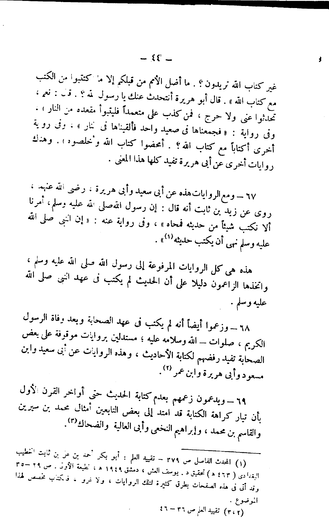 68- وزعموا أيضًا أنه لم يكتب في عهد الصحابة وبعد وفاة الرسول الكريم، صلوات الله وسلامه عليه؛ مستدلين بروايات موقوفة على بعض الصحابة تفيد رفضهم لكتابة الأحاديث، وهذه الروايات عن أبي سعيد وابن مسعود وأبي هريرة وابن عمر2.