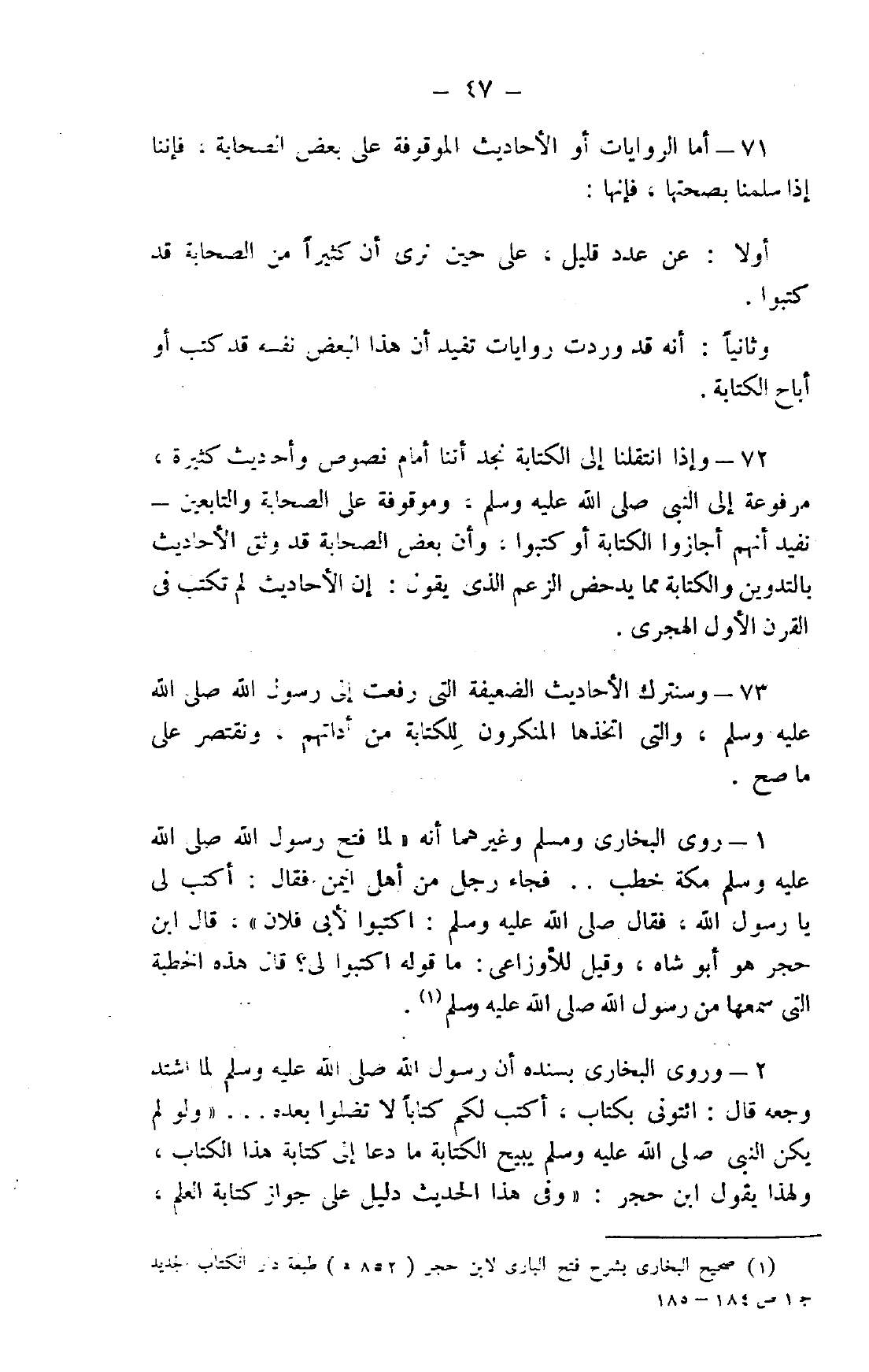 73- وسنترك الأحاديث الضعيفة التي رفعت إلى رسول الله صلى الله عليه وسلم، والتي اتخذها المنكرون للكتابة من أداتهم، ونقتصر على ما صح.