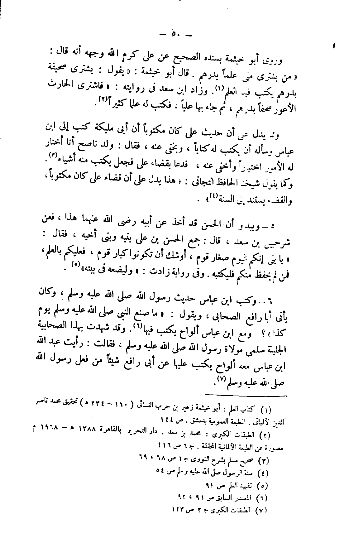 1 كتاب العلم: أبو خيثمة زهير بن حرب النسائي "160 - 234هـ" تحقيق محمد ناصر الدين الألباني. المطبعة العمومية بدمشق. ص144.