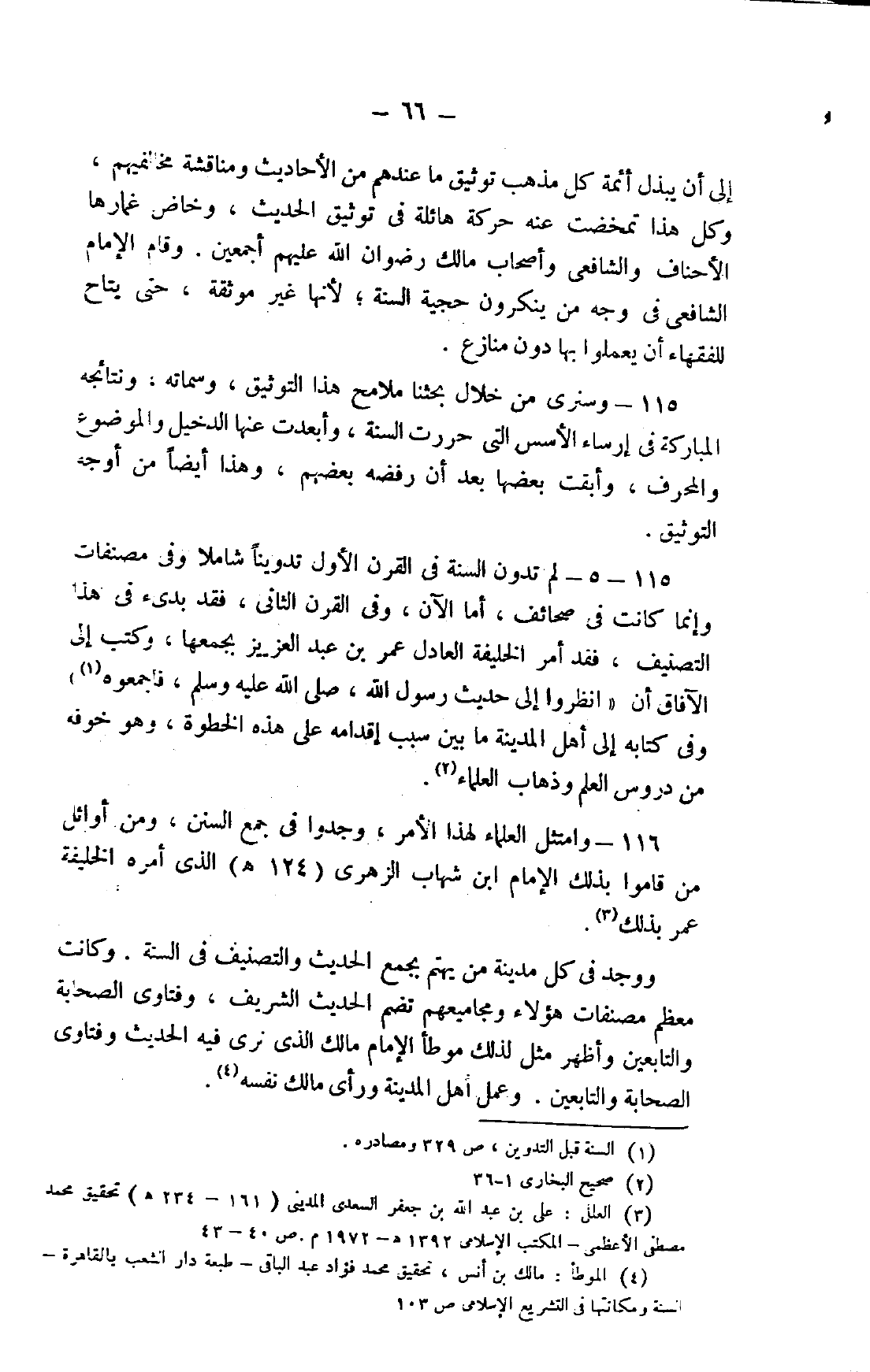 115- وسنرى من خلال بحثنا ملامح هذا التوثيق، وسماته، ونتائجه المباركة في إرساء الأسس التي حررت السنة، وأبعدت عنها الدخيل والموضوع والمحرف، وأبقت بعضها بعد أن رفضه بعضهم، وهذا أيضًا من أوجه التوثيق.