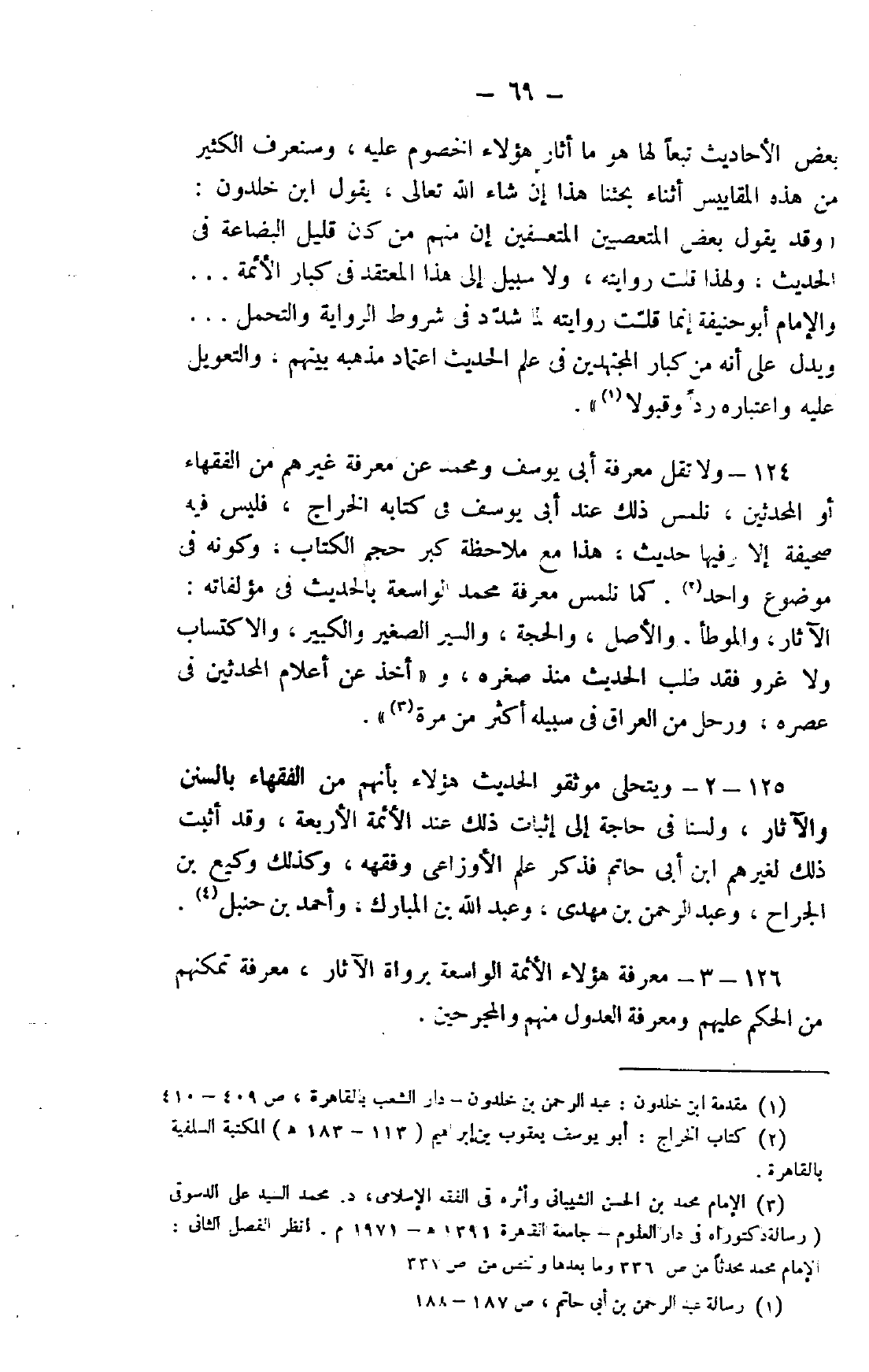 125- 2- ويتحلى موثقو الحديث هؤلاء بأنهم من الفقهاء بالسنن والآثار، ولسنا في حاجة إلى إثبات ذلك عند الأئمة الأربعة، وقد أثبت ذلك لغيرهم ابن أبي حاتم فذكر علم الأوزاعي وفقهه، وكذلك وكيع بن الجراح، وعبد الرحمن بنمهدي، وعبد الله بن المبارك، وأحمد بن حنبل4.