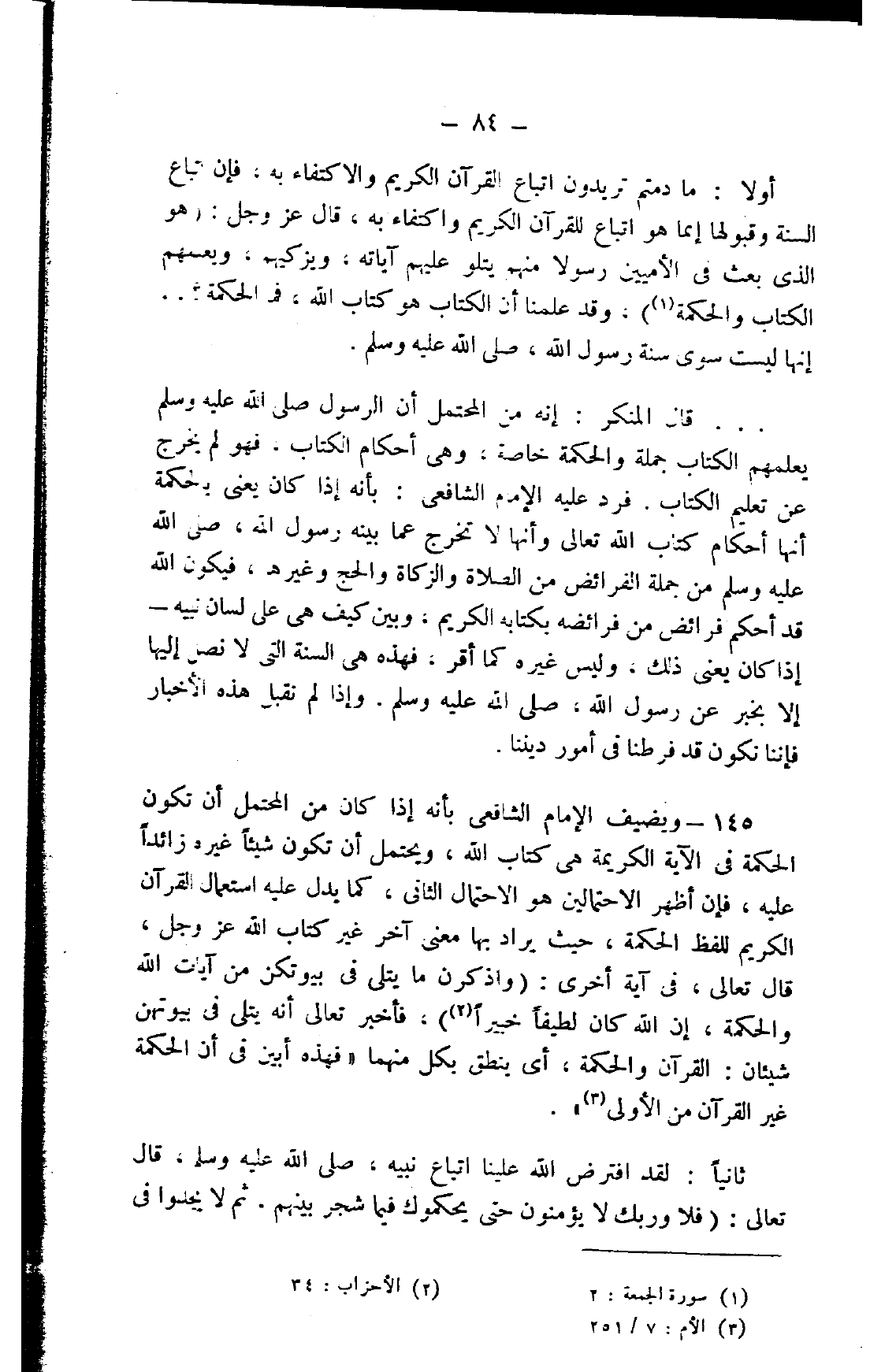 145- ويضيف الإمام الشافعي بأنه إذا كان من المحتمل أن تكون الحكمة في الآية الكريمة هي كتاب الله، ويحتمل أن تكون شيئًا غيره زائدًا عليه، فإن أظهر الاحتمالين هو الاحتمال الثاني، كما يدل عليه استعمال القرآن الكريم للفظ الحكمة، حيث يراد بها معنى آخر غير كتاب الله عز وجل، قال تعالى، في آية أخرى: {وَاذْكُرْنَ مَا يُتْلَى فِي بُيُوتِكُنَّ مِنْ آيَاتِ اللَّهِ وَالْحِكْمَةِ إِنَّ اللَّهَ كَانَ لَطِيفًا خَبِيرًا} 2، فأخبر تعالى أنه يتلى في بيوتهن شيئان: القرآن والحكمة، أي ينطق بكل منهما "فهذه أبين في أن الحكمة غير القرآن من الأولى"3.