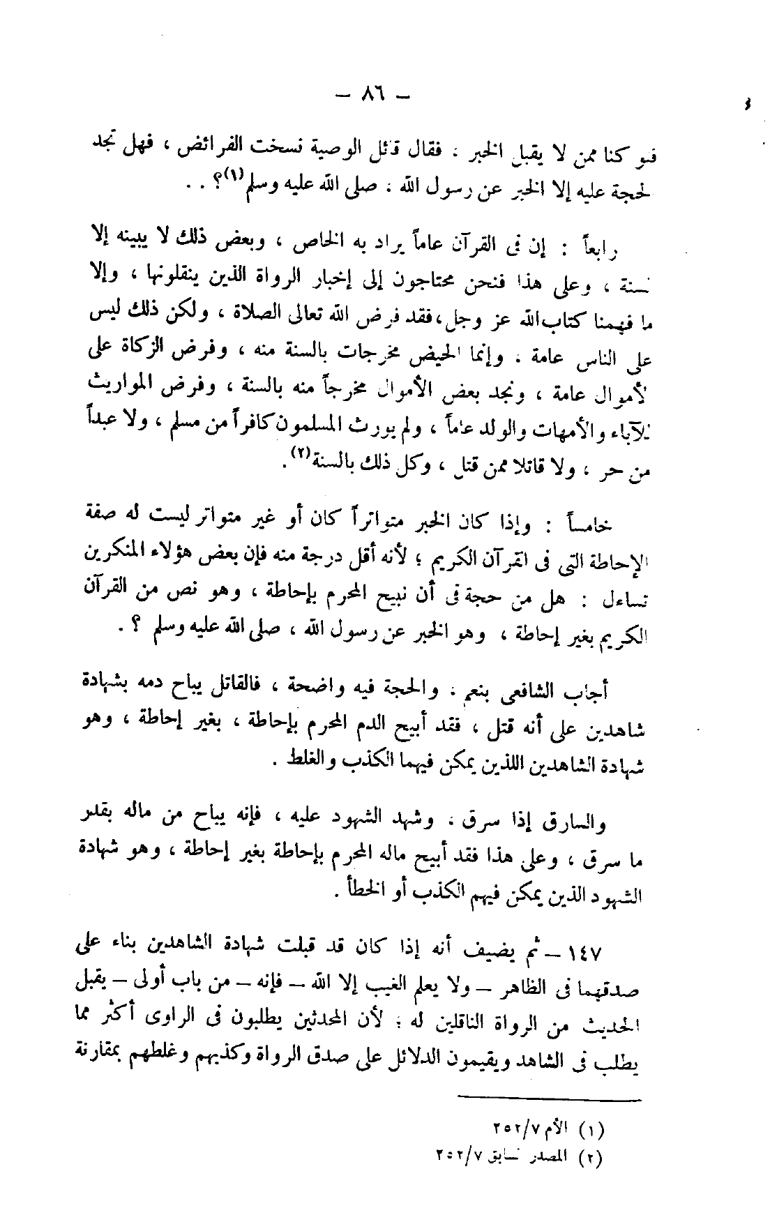 رابعًا: إن في القرآن عامًّا يراد به الخاص، وبعض ذلك لا يبينه إلا السنة، وعلى هذا فنحن محتاجون إلى إخبار الرواة الذين ينقلونها، وإلا ما فهمنا كتاب الله عز وجل، فقد فرض الله تعالى الصلاة، ولكن ذلك ليس على الناس عامة، وإنما الحيض مخرجات بالسنة منه، وفرض الزكاة على الأموال عامة، ونجد بعض الأموال مخرجًا منه بالسنة، وفرض المواريث للآباء والأمهات والولد عامًّا، ولم يورث المسلمون كافرًا من مسلم، ولا عبدًا من حر، ولا قاتلًا ممن قتل، وكل ذلك بالسنة2.