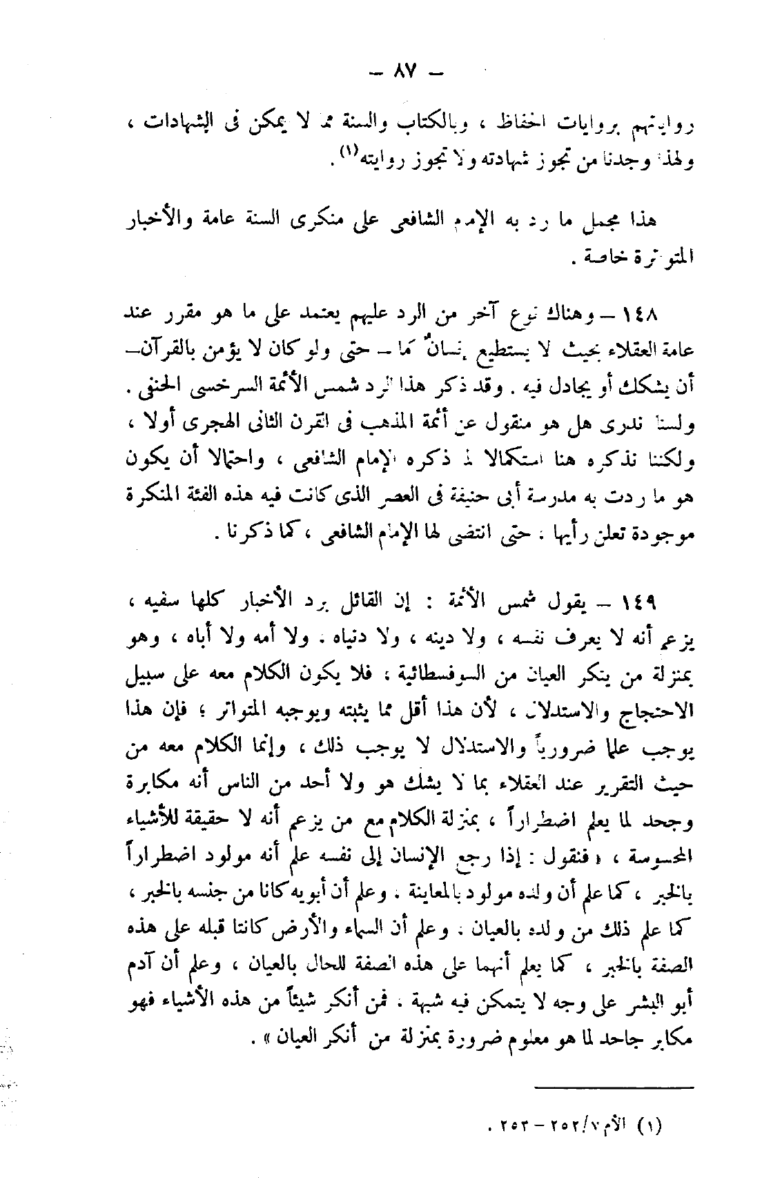 148- وهناك نوع آخر من الرد عليهم يعتمد على ما هو مقرر عند عامة العقلاء بحيث لا يستطيع إنسان ما -حتى ولو كان لا يؤمن بالقرآن- أن يشكك أو يجادل فيه. وقد ذكر هذا الرد شمس الأئمة السرخسي الحنفي.