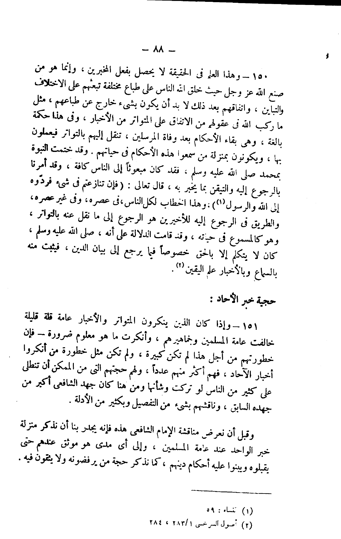 151- وإذا كان الذين ينكرون المتواتر والأخبار عامة قلة قليلة خالفت عامة المسلمين وجماهيرهم، وأنكرت ما هو معلوم ضرورة -فإن خطورتهم من أجل هذا لم تكن كبيرة، ولم تكن مثل خطورة من أنكروا أخبار الآحاد، فهم أكثر منهم عددًا، ولهم حجتهم التي من الممكن أن تنطلي على كثير من الناس لو تركت وشأنها ومن هنا كان جهد الشافعي أكبر من جهده السابق، وناقشهم بشيء من التفصيل وبكثير من الأدلة.