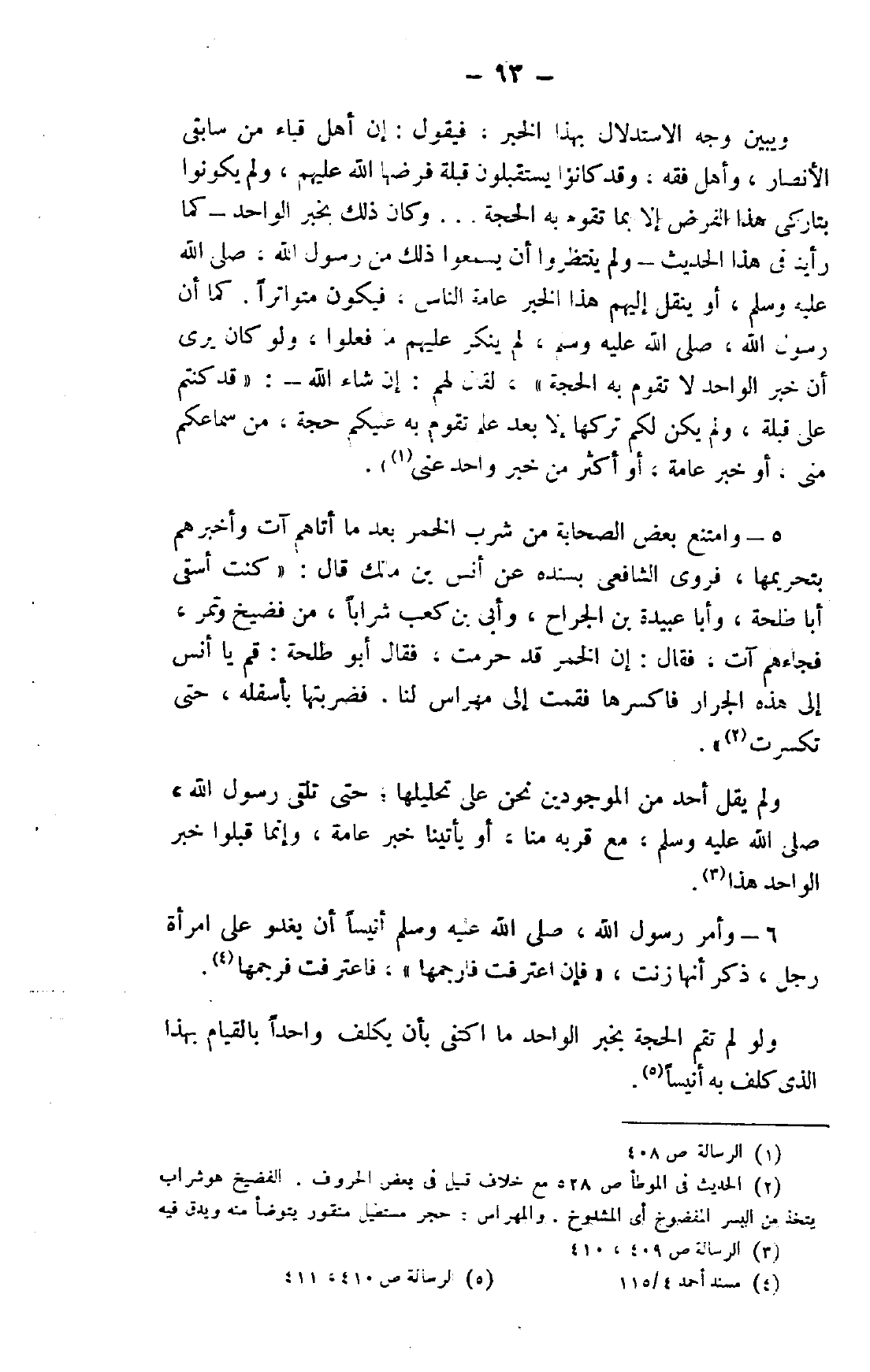 ويبين وجه الاستدلال بهذا الخبر، فيقول: إن أهل قباء من سابقي الأنصار، وأهل فقه، وقد كانوا يستقبلون قبلة فرضها الله عليهم، ولم يكونوا بتاركي هذا الفرض إلا بما تقوم به الحجة ... وكان ذلك بخبر الواحد -كما رأينا في هذا الحديث- ولم ينتظروا أن يسمعوا ذلك من رسول الله، صلى الله عليه وسلم، أو ينقل إليهم هذا الخبر عامة الناس، فيكون متواترًا. كما أن رسول الله، صلى الله عليه وسلم، لم ينكر عليهم ما فعلوا، ولو كان يرى أن خبر الواحد لا تقوم به الحجة"، لقال لهم: إن شاء الله-: "قد كنتم على قبلة، ولم يكن لكم تركها إلا بعد علم تقوم به عليكم حجة، من سماعكم مني، أو خبر عامة، أو أكثر من خبر واحد عني"1.