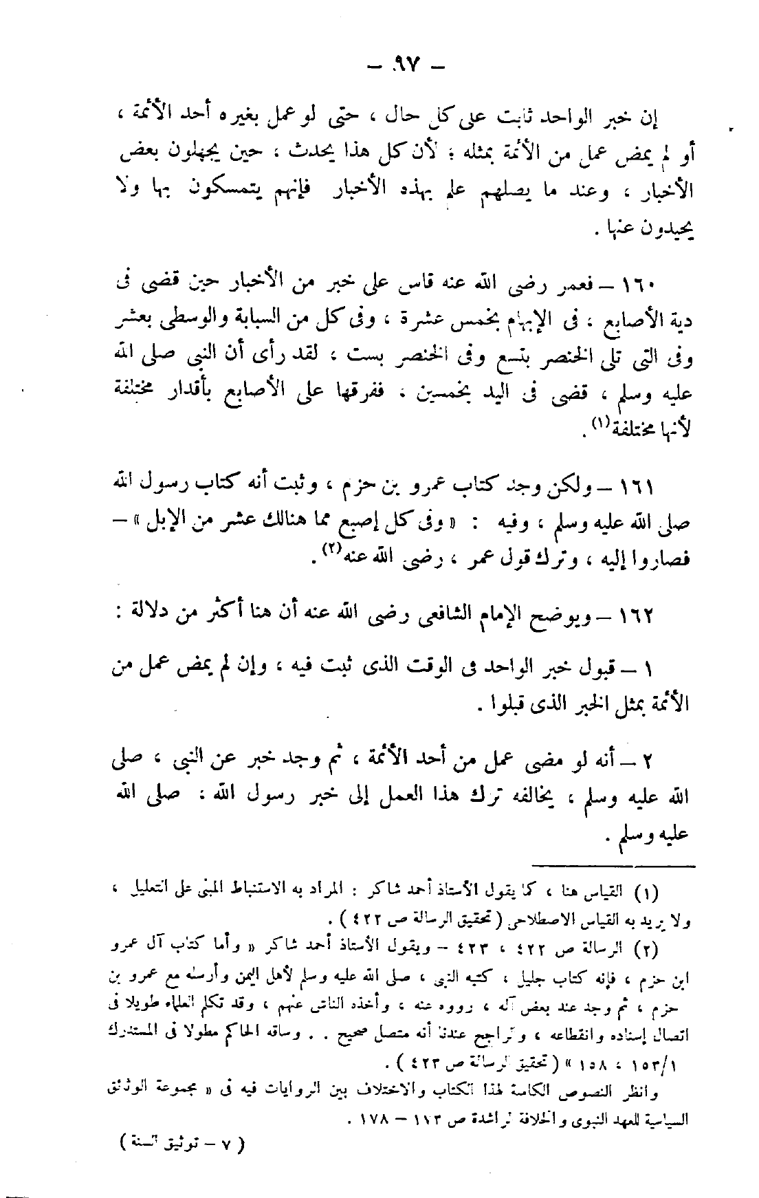 2 الرسالة ص422، 423 - ويقول الأستاذ أحمد شاكر: "وأما كتاب آل عمرو ابن حزم، فإنه كتاب جليل، كتبه النبي، صلى الله عليه وسلم لأهل اليمن وأرسله مع عمرو بن حزم، ثم وجد عند بعض آله، رووه عنه، وأخذه الناس عنهم، وقد تكلم العلماء طويلًا في اتصال إسناده وانقطاعه، والراجح عندنا أنه متصل صحيح.. وساقه الحاكم مطولًا في المستدرك 1/ 153، 158" "تحقيق الرسالة ص423".
