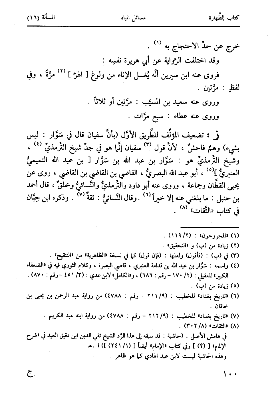 ز: تضعيف المؤلف للطَريق الأوَل (بأن سفيان قال في سَوَّار: ليس بشيء) وهمَّ فاحشٌ، لأن قول (3) سفيان إنَما هو في جد شيخ الترمذي (4)، وشيخ الترمذي هو: سَوَار بن عبد الله بن سَوَار [بن عبد الله التميميُ العنبريَّ] (5)، أبو عبد الله البصريَّ، القاضي بن القاضي بن القاضي، روى عن يحيى القطَان وجماعة، وروى عنه أبو داود والترمذيَّ والنَسائيُ وخلقٌ، قال أحمد بن حنبل: ما بلغني عنه إلا خيراً (6). وقال النَسائيُ: ثقةٌ (7). وذكره ابن حِبَان في كتاب "الثَّقات" (8).