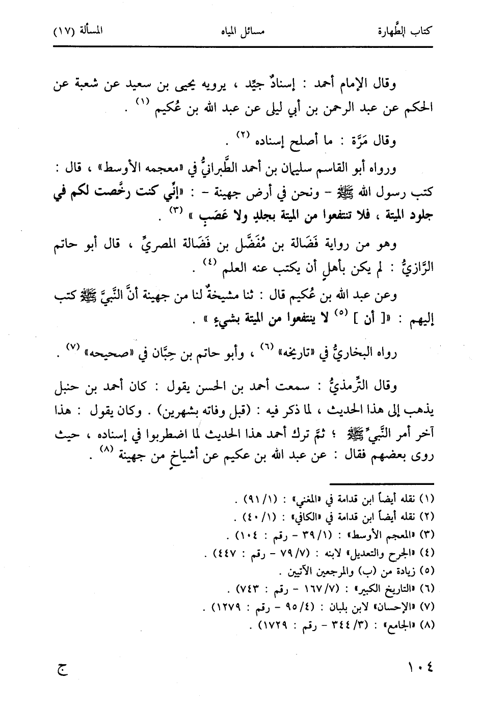 وقال الترمذيَّ: سمعت أحمد بن الحسن يقول: كان أحمد بن حنبل يذهب إلى هذا الحديث، لما ذكر فيه: (قبل وفاته بشهرين). وكان يقول: هذا آخر أمر النَبيَّ صَلَّى اللَّهُ عَلَيْهِ وَسَلَّمَ؛ ثمَّ ترك أحمد هذا الحديث لما اضطربوا في إسناده، حيث روى بعضهم فقال: عن عبد الله بن عكيم عن أشياخِ من جهينة (8).