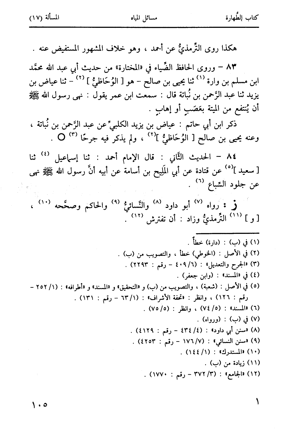 84 - الحديث الثَاني: قال الإمام أحمد: ثنا إسماعيل (4) ثنا [سعيد] (5) عن قتادة عن أبي المَلِيح بن أسامة عن أبيه أن رسول الله صَلَّى اللَّهُ عَلَيْهِ وَسَلَّمَ نهى عن جلود السباع (6).