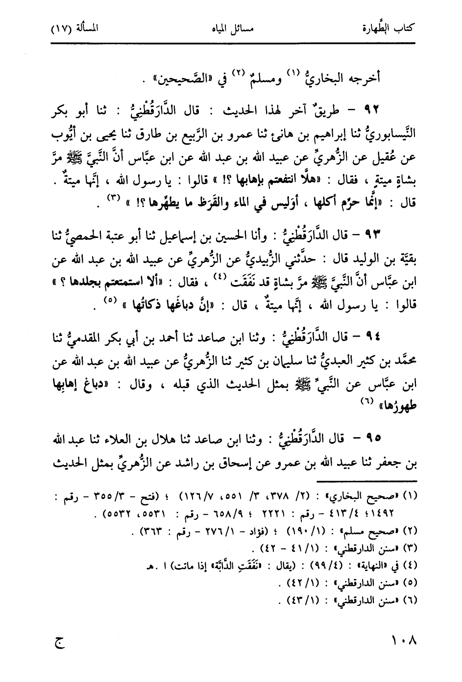 93 - قال الدَارَقُطْنيُ: وأنا الحسين بن إسماعيل ثنا أبو عتبة الحمصيُ ثنا بقيَة بن الوليد قال: حدَثني الزبيديَّ عن الزهري عن عبيد الله بن عبد الله عن ابن عبَّاس أنَ النَّبيَّ صَلَّى اللَّهُ عَلَيْهِ وَسَلَّمَ مرَّ بشاةِ قد نَفَقَت (4)، فقال: "ألا استمتعتم بجلدها؟ "