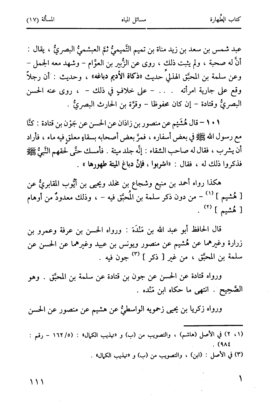 101 - قال هُشَيم عن منصور بن زاذان عن الحسن عن جَوْن بن قتادة: كنَا مع رسول الله صَلَّى اللَّهُ عَلَيْهِ وَسَلَّمَ في بعض أسفاره، فمرَّ بعض أصحابه بسقاءَ معلقِ فيه ماء، فأراد أن يشرب، فقال له صاحب السقاء: إنَه جلد ميتة. فأمسك حتَى لحقهم النَبيُ صَلَّى اللَّهُ عَلَيْهِ وَسَلَّمَ فذكروا ذلك له، فقال: "اشربوا، فإن دباغ الميتة طهورها ".