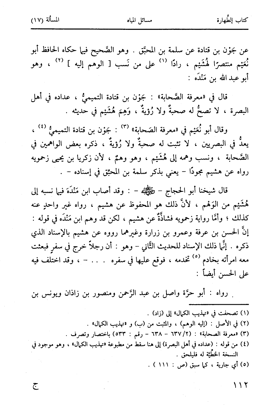 وقال أبو نُعَيْم في "معرفة الصَحابة" (3): جَوْن بن قتادة التميميُّ (4)، يعدُّ في البصريين، لا تثبت له صحبةٌ ولا رُؤية، ذكره بعض الواهمين في الصَّحابة، ونسب وهمه إلى هُشَيم، وهو وهم، لأن زكريا بن يحيى زحمويه رواه عن هشيم مجوداً- يعني بذكر سلمة بن المحبَّق في إسناده-.