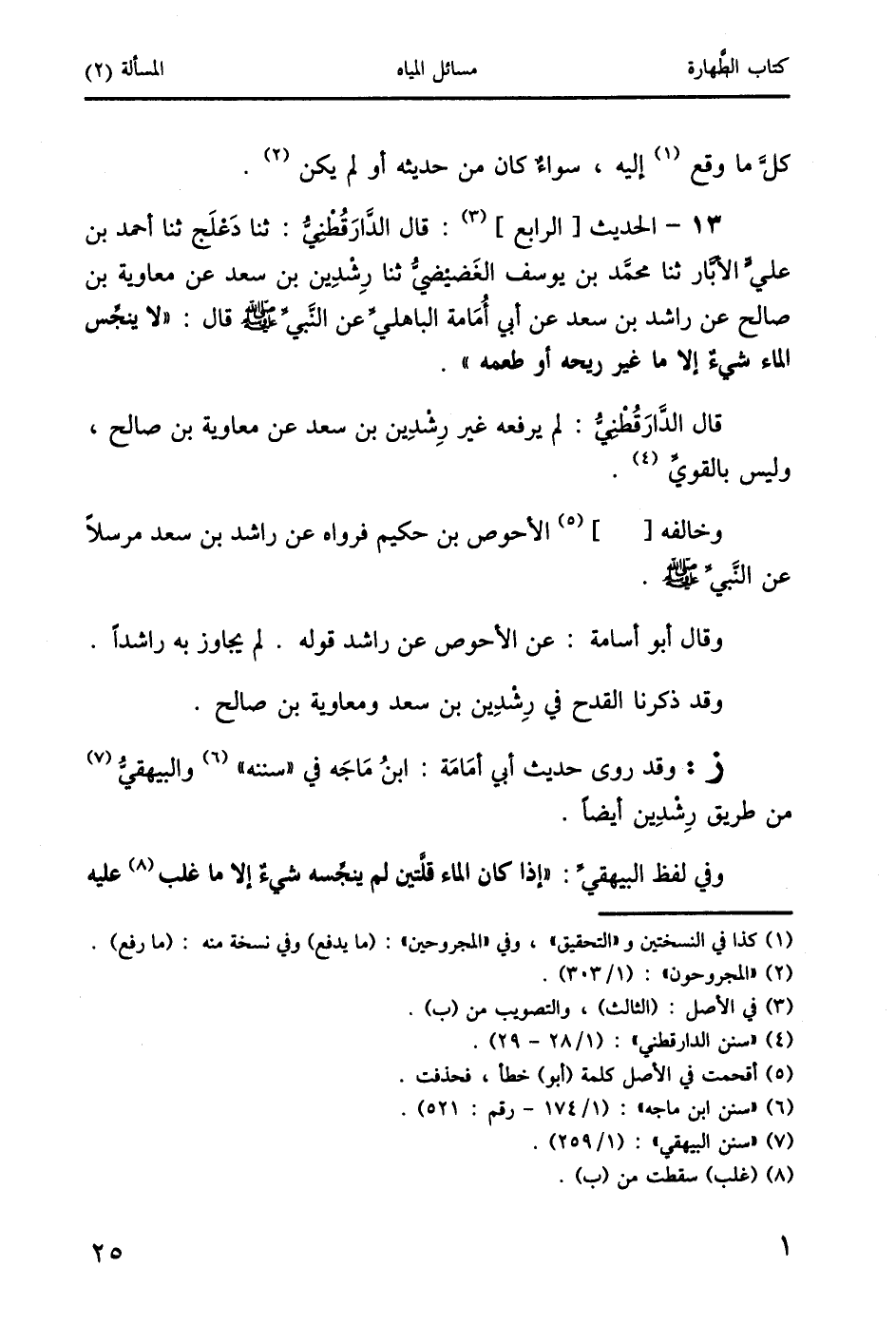 13 - الحديث [الرابع] (3): قال الدارقطني: ثنا دَعْلَج ثنا أحمد بن عليٍّ الأبَّار ثنا محمَّد بن يوسف الغَضيْضيُّ ثنا رِشْدِين بن سعد عن معاوية بن صالح عن راشد بن سعد عن أبي أُمَامة الباهليِّ عن النَّبيِّ صَلَّى اللَّهُ عَلَيْهِ وَسَلَّمَ قال: "لا ينجِّس الماء شيءٌ إلا ما غير ريحه أو طعمه".