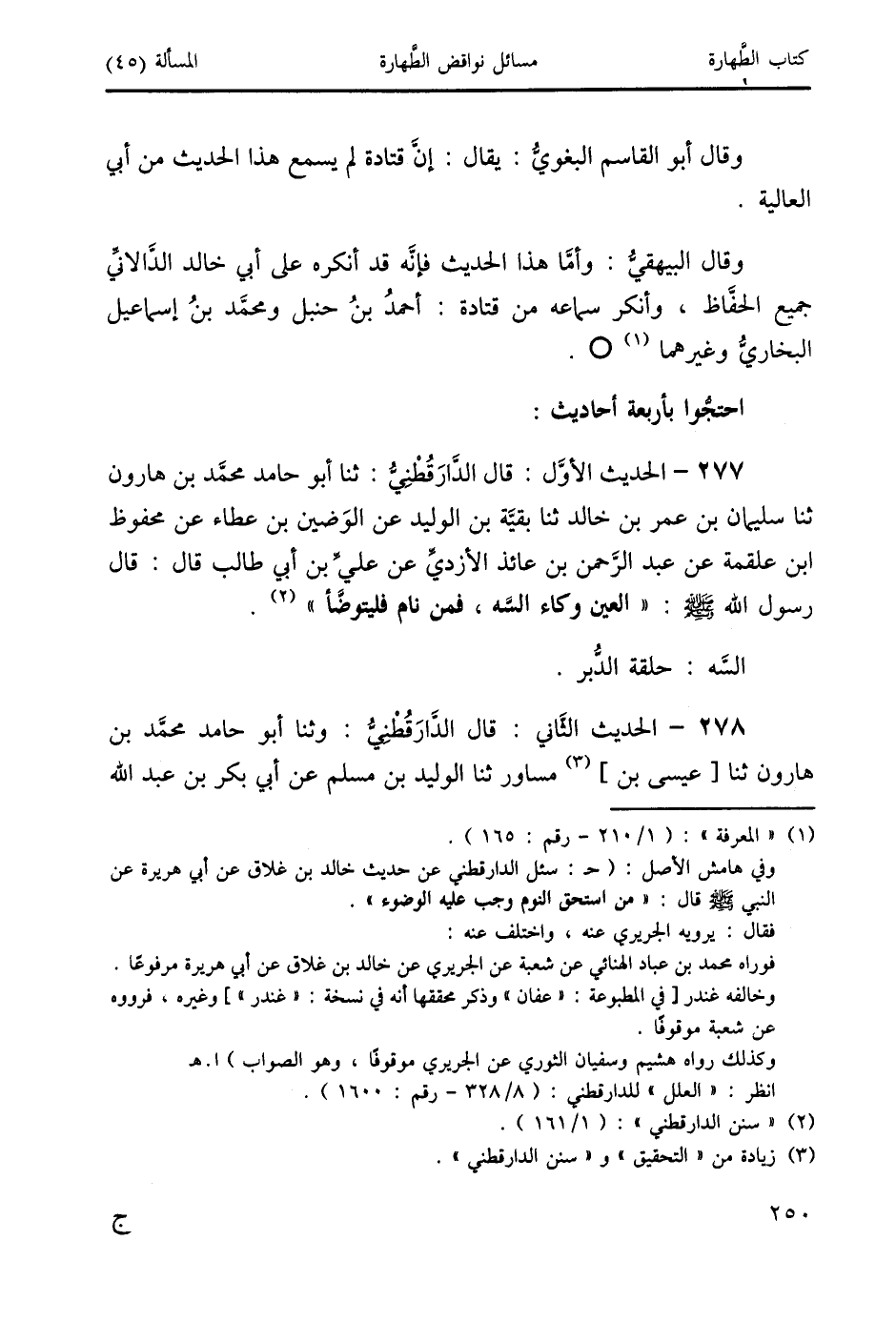 وفي هامش الأصل: (حـ: سئل الدارقطني عن حديث خالد بن غلاق عن أبي هريرة عن النبي صَلَّى اللَّهُ عَلَيْهِ وَسَلَّمَ قال: " من استحق النوم وجب عليه الوضوء".