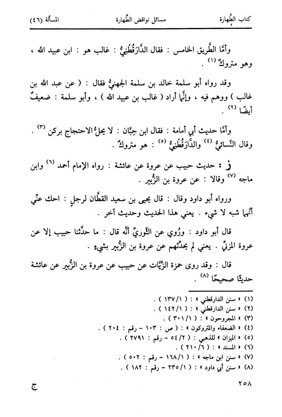 ز: حديث حبيب عن عروة عن عائشة: رواه الإمام أحمد (6) وابن ماجه (7) وقالا: عن عروة بن الزبير.