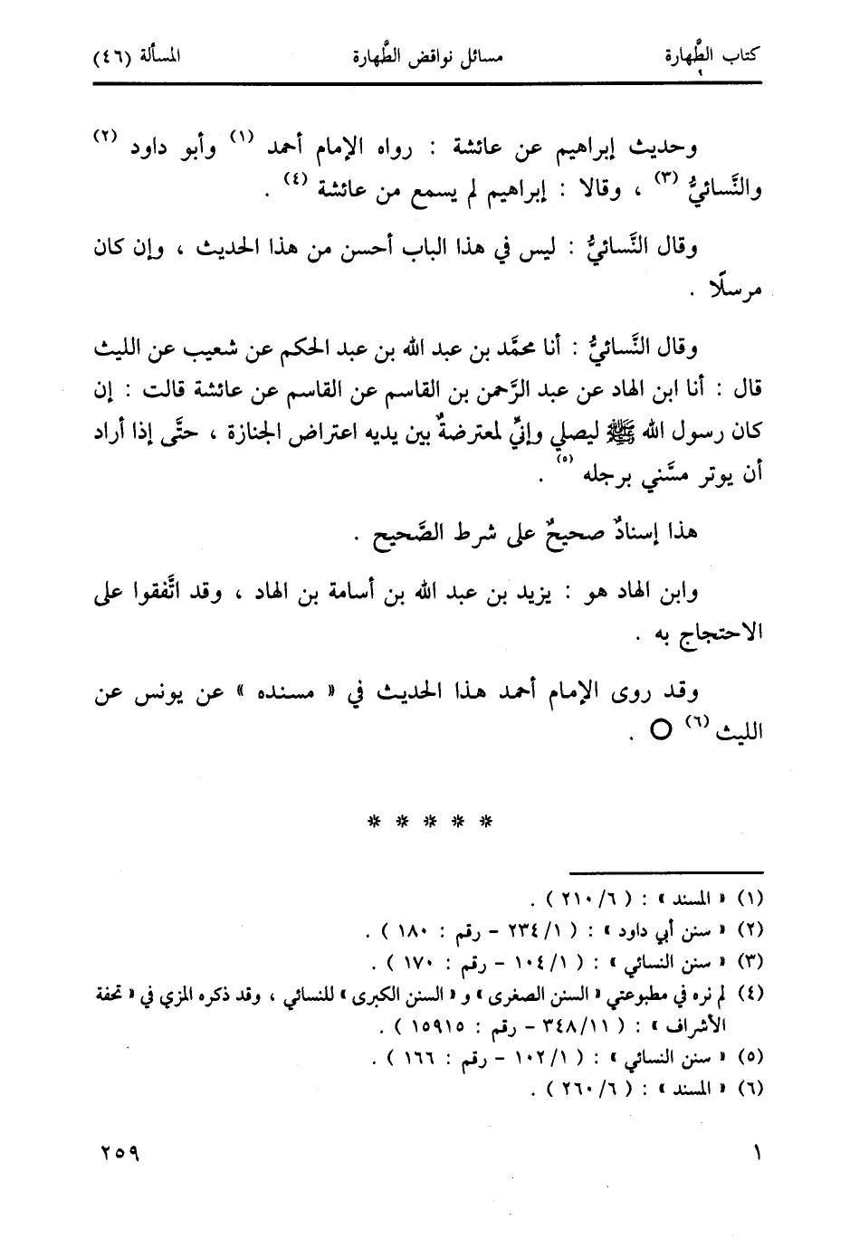 وقال النسائيُ: أنا محمَّد بن عبد الله بن عبد الحكم عن شعيب عن الليث قال: أنا ابن الهاد عن عبد الرَحمن بن القاسم عن القاسم عن عائشة قالت: إن كان رسول الله صَلَّى اللَّهُ عَلَيْهِ وَسَلَّمَ ليصلي وإني لمعترضةٌ بين يديه اعتراض الجنازة، حتَّى إذا أراد أن يوتر مسَّني برجله (5).
