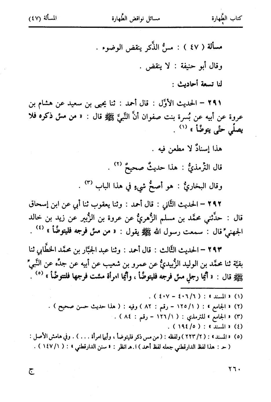 (5) "المسند": (2/ 223) ولفظه: (من مس ذكر فليتوضأ، وأيما امرأة ...). وفي هامش الأصل: (حـ: هذا لفظ الدارقطني جعله لفظ أحمد) ا. هـ انظر: "سنن الدارقطني": (1/ 147).