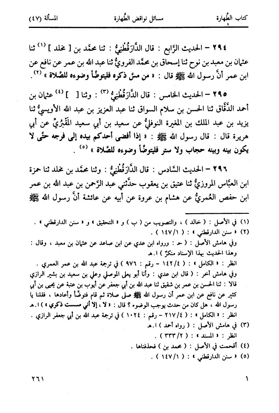 294 - الحديث الرَابع: قال الدارَقُطنيى: ثنا محمَّد بن [مخلد] (1) ثنا عثمان بن معبد بن نوح ثنا إسحاق بن محمد الفرويَّ ثنا عبد الله بن عمر عن نافع عن ابن عمر أنَ رسول الله صَلَّى اللَّهُ عَلَيْهِ وَسَلَّمَ قال: "من مسَّ ذكره فليتوضأ وضوءه للصَّلاة" (2).