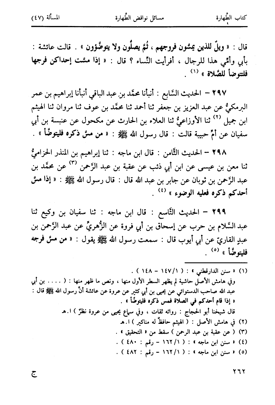 298 - الحديث الثَامن: قال ابن ماجه: ثنا إبراهيم بن المنذر الحزاميُ ثنا معن بن عيسى عن ابن أبي ذئب عن عقبة بن عبد الرَحمن (3) عن محمَّد بن عبد الرَحمن بن ثوبان عن جابر بن عبد الله قال: قال رسول الله صَلَّى اللَّهُ عَلَيْهِ وَسَلَّمَ: " إذا مسَّ أحدكم ذكره فعليه الوضوء" (4).