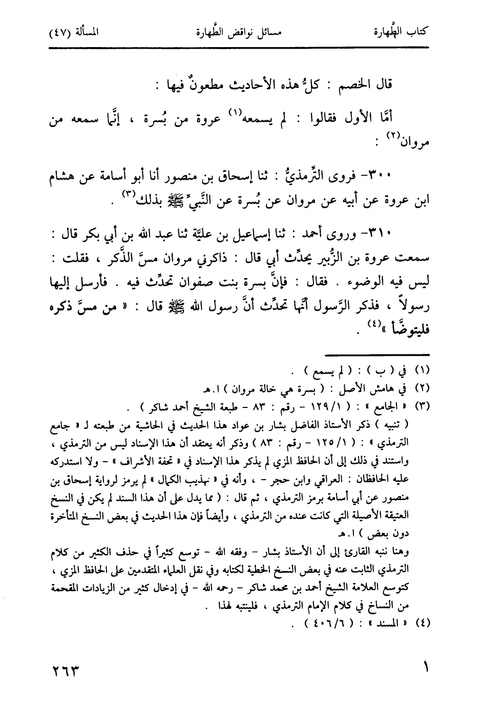 300 - فروى الترمذيَّ: ثنا إسحاق بن منصور أنا أبو أسامة عن هشام ابن عروة عن أبيه عن مروان عن بُسرة عن النَبيِّ صَلَّى اللَّهُ عَلَيْهِ وَسَلَّمَ بذلك (3).