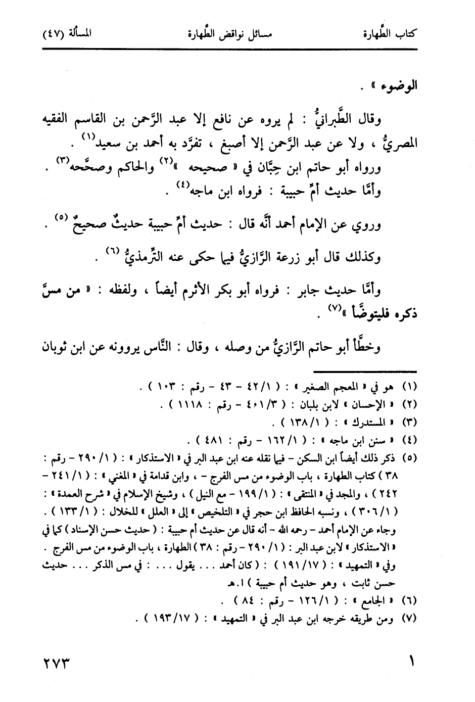 وفي "التمهيد": (17/ 191): (كان أحمد ... يقول ... : في مس الذكر ... حديث حسن ثابت، وهو حديث أم حبيبة) ا. هـ