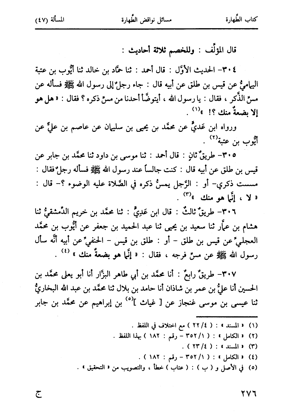 306 - طريقٌ ثالثٌ: قال ابن عَديٍّ: ثنا محمَّد بن خريم الدمشقيُ ثنا هشام بن عمَّار ثنا سعيد بن يحيى ثنا عبد الحميد بن جعفر عن أيُّوب بن محمَّد العجليَّ عن قيس بن طلق- أو: طلق بن قيس- الحنفيَّ عن أبيه أَنَّه سأل رسول الله صَلَّى اللَّهُ عَلَيْهِ وَسَلَّمَ عن مسِّ فرجه، فقال: "إنَّما هو بضعةٌ منك" (4).