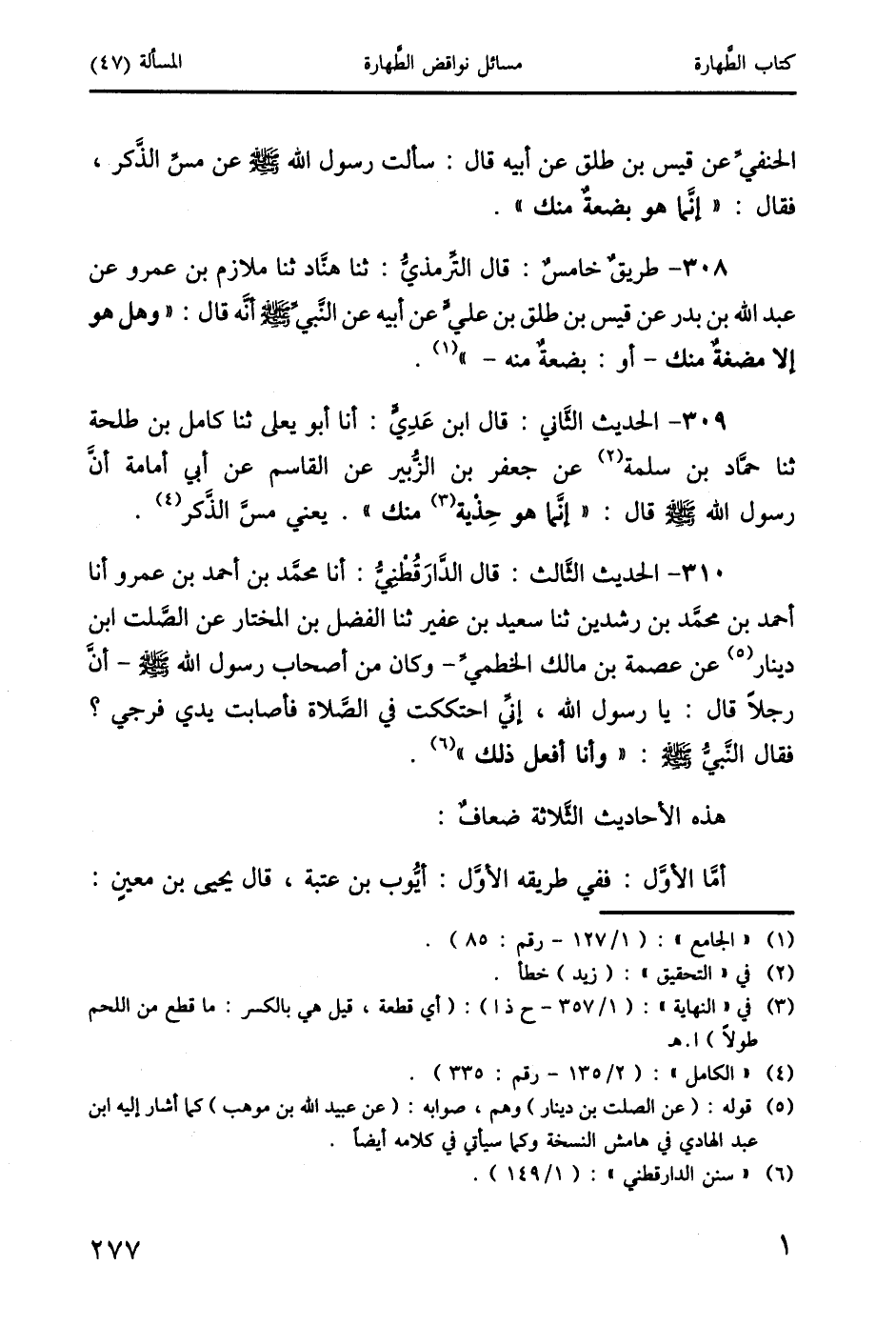 308 - طريقٌ خامسٌ: قال الترمذيُ: ثنا هنَّاد ثنا ملازم بن عمرو عن عبد الله بن بدر عن قيس بن طلق بن عليٍّ عن أبيه عن النَّبيَّ صَلَّى اللَّهُ عَلَيْهِ وَسَلَّمَ أَنه قال: " وهل هو إلا مضغةٌ منك- أو: بضعةٌ منه- " (1).