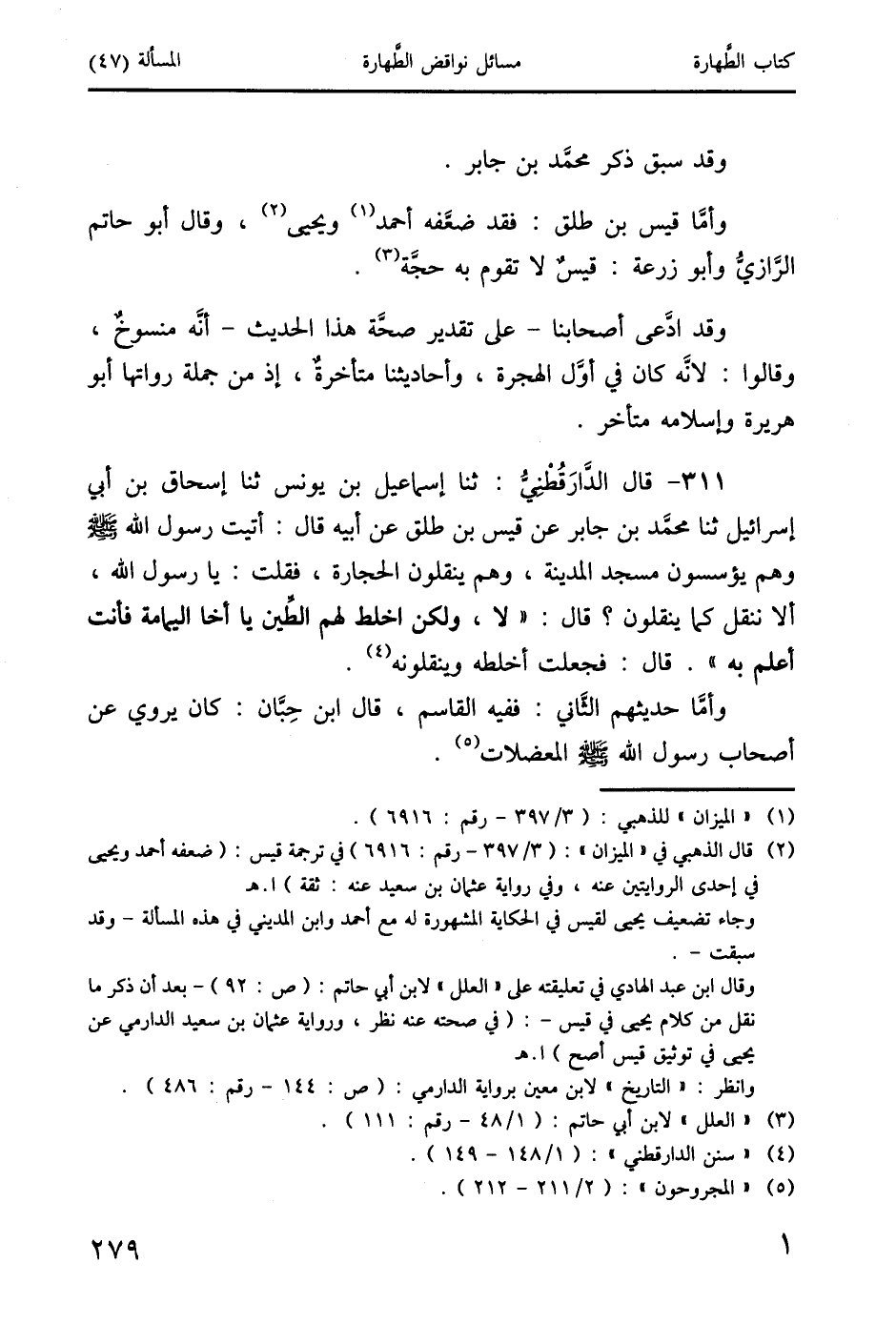 311 - قال الدَارَقُطْنيُ: ثنا إسماعيل بن يونس ثنا إسحاق بن أبي إسرائيل ثنا محمَّد بن جابر عن قيس بن طلق عن أبيه قال: أتيت رسول الله صَلَّى اللَّهُ عَلَيْهِ وَسَلَّمَ وهم يؤسسون مسجد المدينة، وهم ينقلون الحجارة، فقلت: يا رسول الله، ألا ننقل كما ينقلون؟ قال: " لا، ولكن اخلط لهم الطَّين يا أخا اليمامة فأنت أعلم به ". قال: فجعلت أخلطه وينقلونه (4).