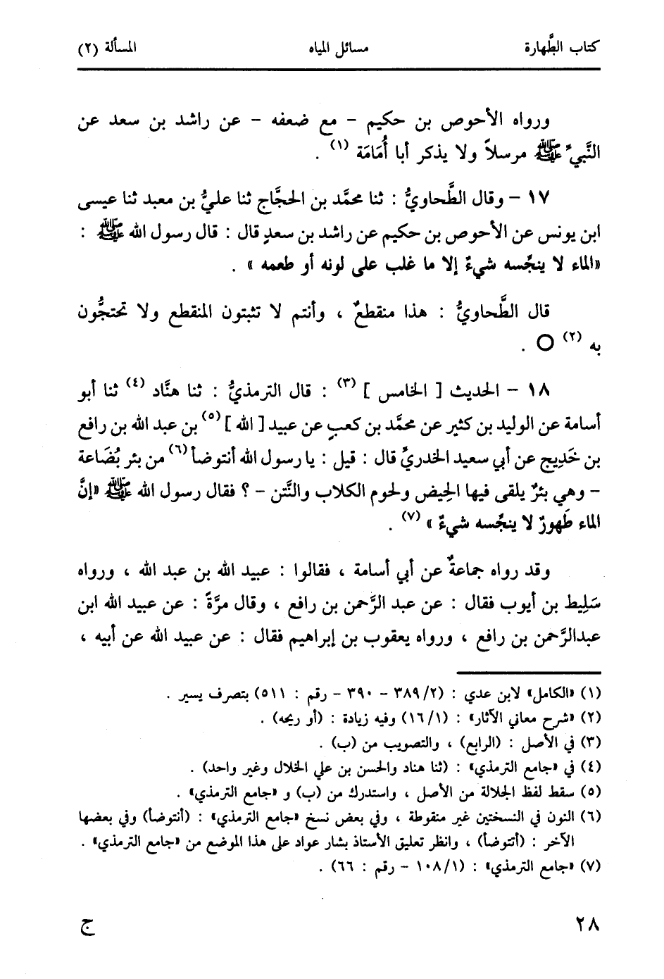 18 - الحديث [الخامس] (3): قال الترمذيُّ: ثنا هنَّاد (4) ثنا أبو أسامة عن الوليد بن كثير عن محمَّد بن كعبٍ عن عبيد [الله] (5) بن عبد الله بن رافع بن خَدِيج عن أبي سعيد الخدريِّ قال: قيل: يا رسول الله أنتوضأ (6) من بئر بُضَاعة - وهي بئرٌ يلقى فيها الحِيض ولحوم الكلاب والنَّتن-؟ فقال رسول الله صَلَّى اللَّهُ عَلَيْهِ وَسَلَّمَ "إنَّ الماء طَهورٌ لا ينجِّسه شيءٌ" (7).