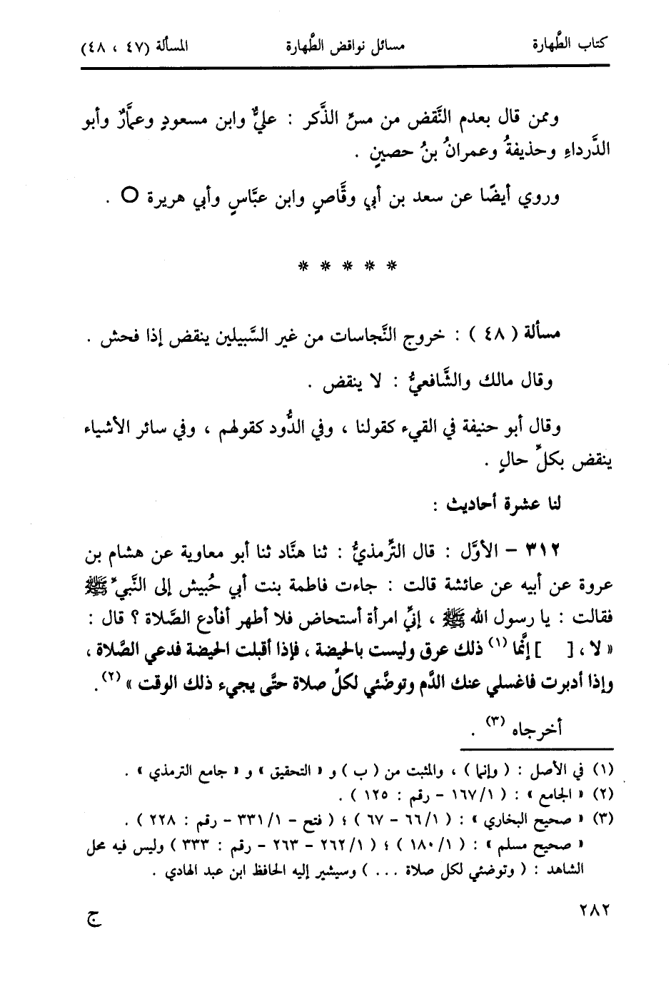 312 - الأوَّل: قال التِّرمذيُّ: ثنا هنَّاد ثنا أبو معاوية عن هشام بن عروة عن أبيه عن عائشة قالت: جاءت فاطمة بنت أبي حُبيش إلى النبيَّ صَلَّى اللَّهُ عَلَيْهِ وَسَلَّمَ فقالت: يا رسول الله صَلَّى اللَّهُ عَلَيْهِ وَسَلَّمَ، إني امرأة أستحاض فلا أطهر أفأدع الصَّلاة؟ قال: "لا، [] إنَّما (1) ذلك عرق وليست بالحيضة، فإذا أقبلت الحيضة فدعي الصَّلاة، وإذا أدبرت فاغسلي عنك الدَّم وتوضَّئي لكلَّ صلاة حتَّى يجيء ذلك الوقت" (2).
