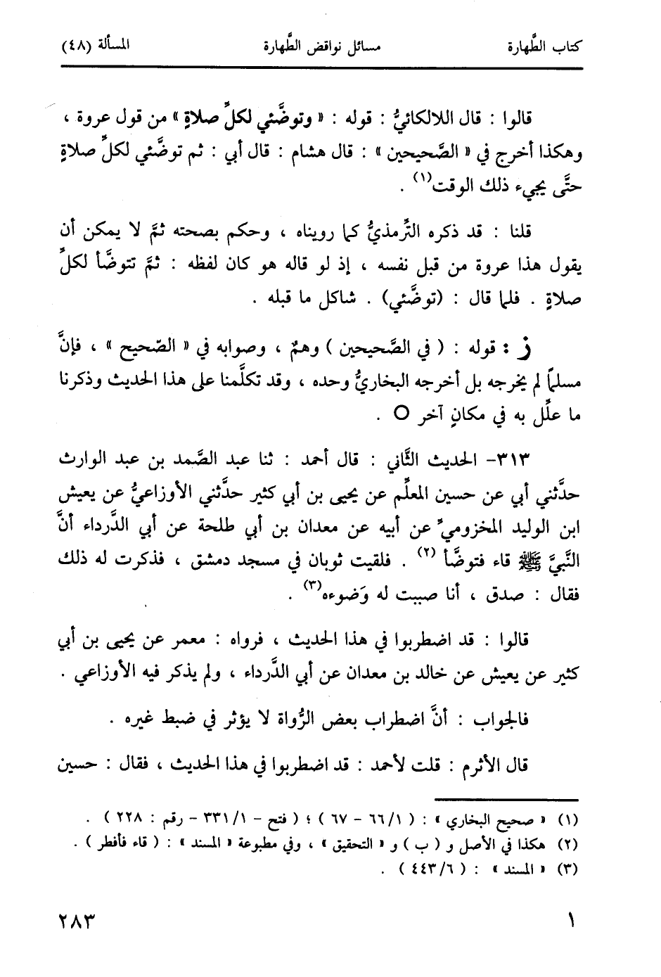 313 - الحديث الثَاني: قال أحمد: ثنا عبد الصَمد بن عبد الوارث حدَثني أبي عن حسين المعلم عن يحيى بن أبي كثير حدَثني الأوزاعيُ عن يعيش ابن الوليد المخزومي عن أبيه عن معدان بن أبي طلحة عن أبي الدَّرداء أنَّ النَّبيَّ صَلَّى اللَّهُ عَلَيْهِ وَسَلَّمَ قاء فتوضَّأ (2). فلقيت ثوبان في مسجد دمشق، فذكرت له ذلك فقال: صدق، أنا صببت له وَضوءه (3).