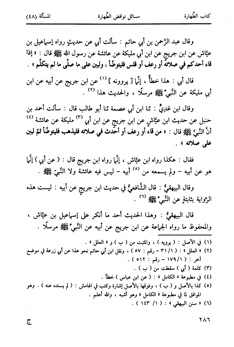 وقال عبد الرحمن بن أبي حاتم: سألت أبي عن حديثِ رواه إسماعيل بن عيَّاش عن ابن جريج عن ابن أبي مليكة عن عائشة عن رسول الله صَلَّى اللَّهُ عَلَيْهِ وَسَلَّمَ قال: "إذا قاء أحدكم في صلاته أو رعف أو قلس فليتوضَّأ، وليبن على ما صلَّى ما لم يتكلم".